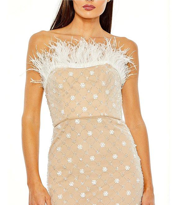 From Mac Duggal, this dress features: Mesh fabrication Column gown silhouette Strapless neckline Sleeveless Embellished Feather neckline trim Zip back closure Approx. 45"length Polyester Dry clean Imported.