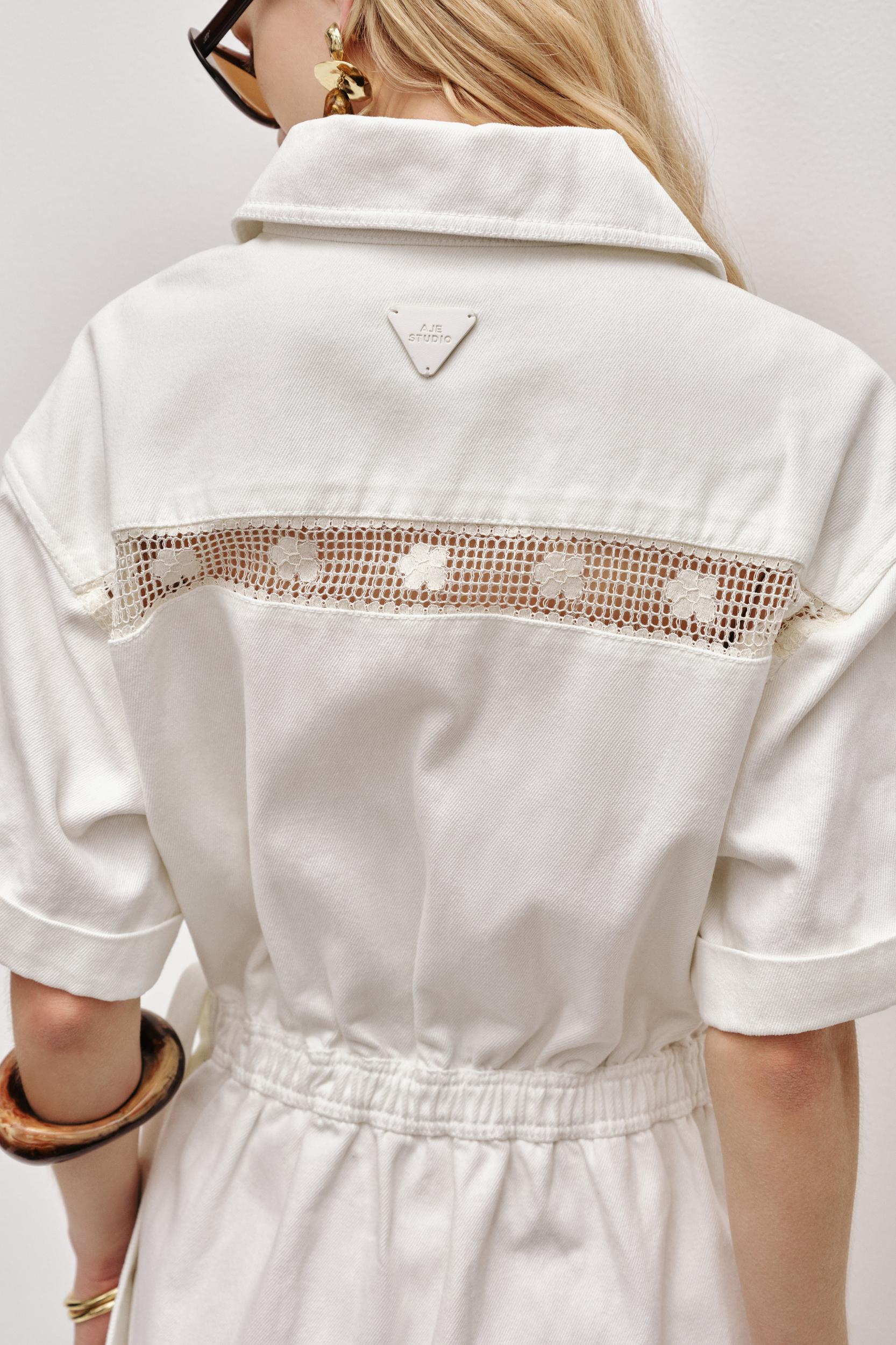 PRODUCT DETAILS Aje Studio Women's shirt dress Relaxed fit Mini length Contrast lace panel detail Concealed button placket Faux wrap front skirt Functional side...