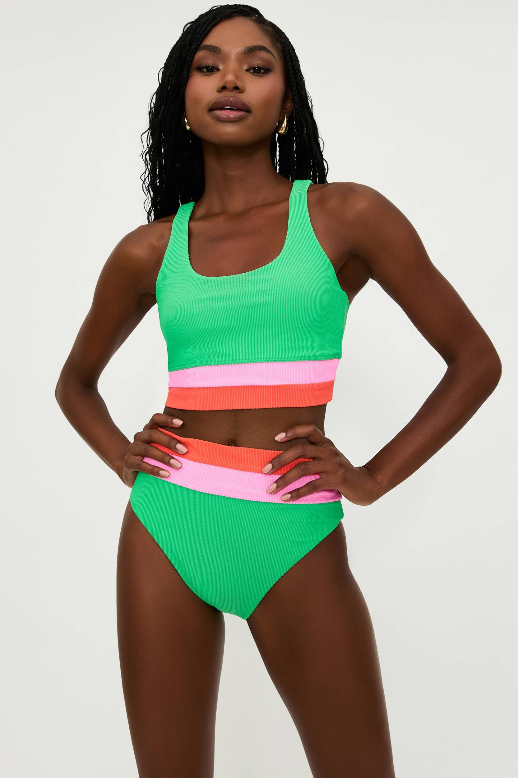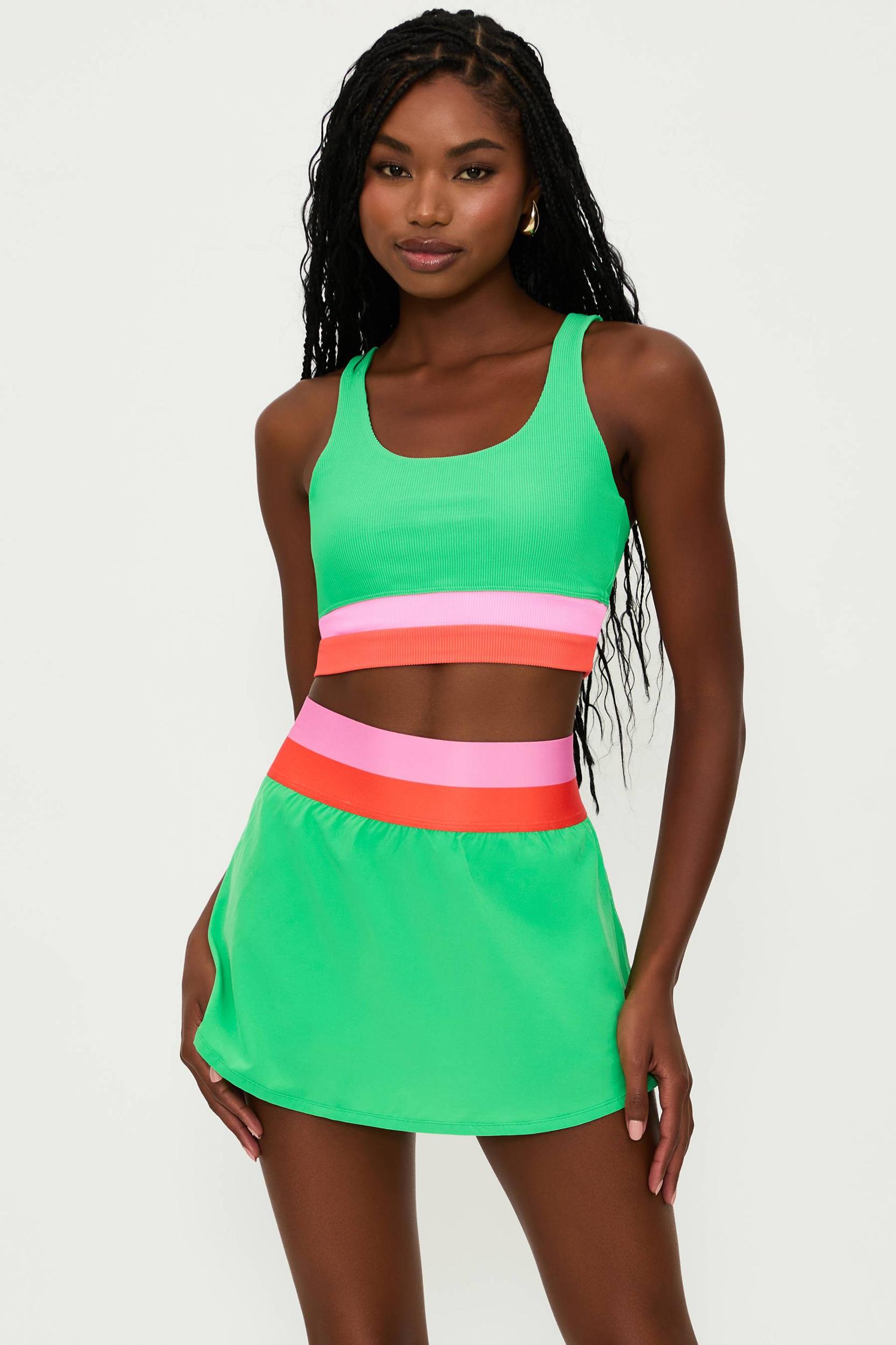 Supportive and sporty, the Mackenzie top has a cropped silhouette and ultra-soft ribbed fabric with a scoop neckline and thick shoulder straps. Pair this top with the Heidi Bottom in Island Green for a chic look for the beach or the Coast Skirt in Island Green for the perfect courtside look. 82% POLYESTER 18% SPANDEX Model is wearing size small FINAL SALE
