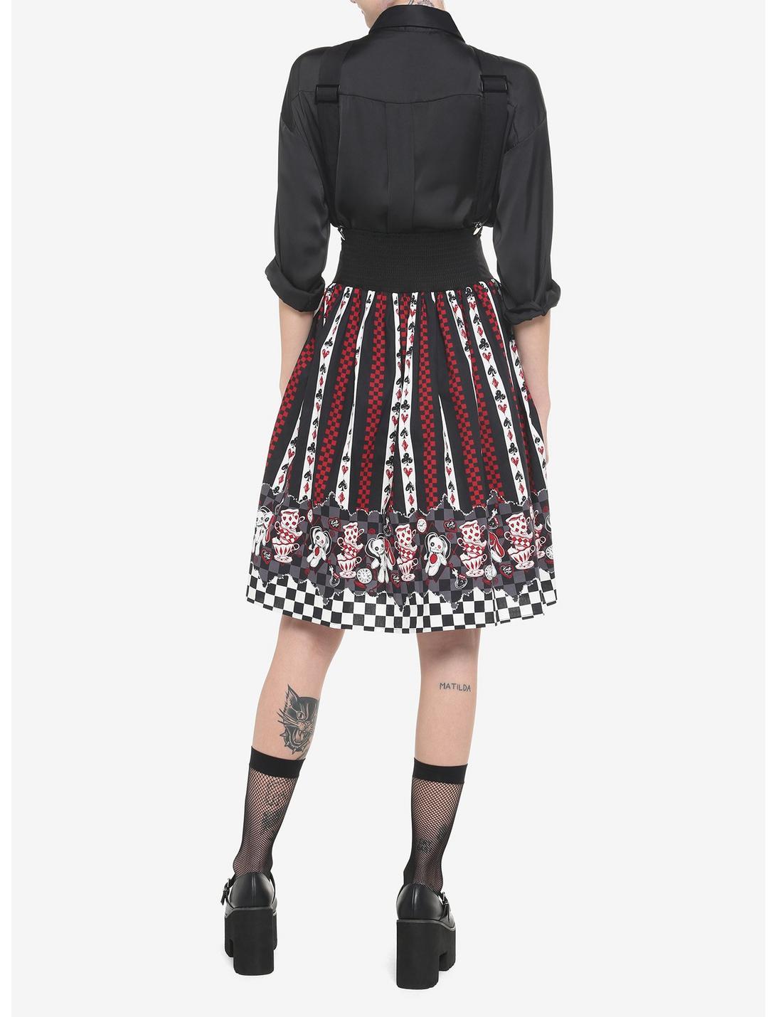 Headed for a dark-yet-delightful date? Avoid being late by throwing on this mad tea party-inspired suspender skirt, featuring playing card symbols, checkers and mad tea party supplies at the bottom. There are pockets, a smocked waistband with decorative buttons, and removable suspenders.97% cotton; 3% spandexWash cold; dry lowImportedListed in junior sizesModel wears size Small