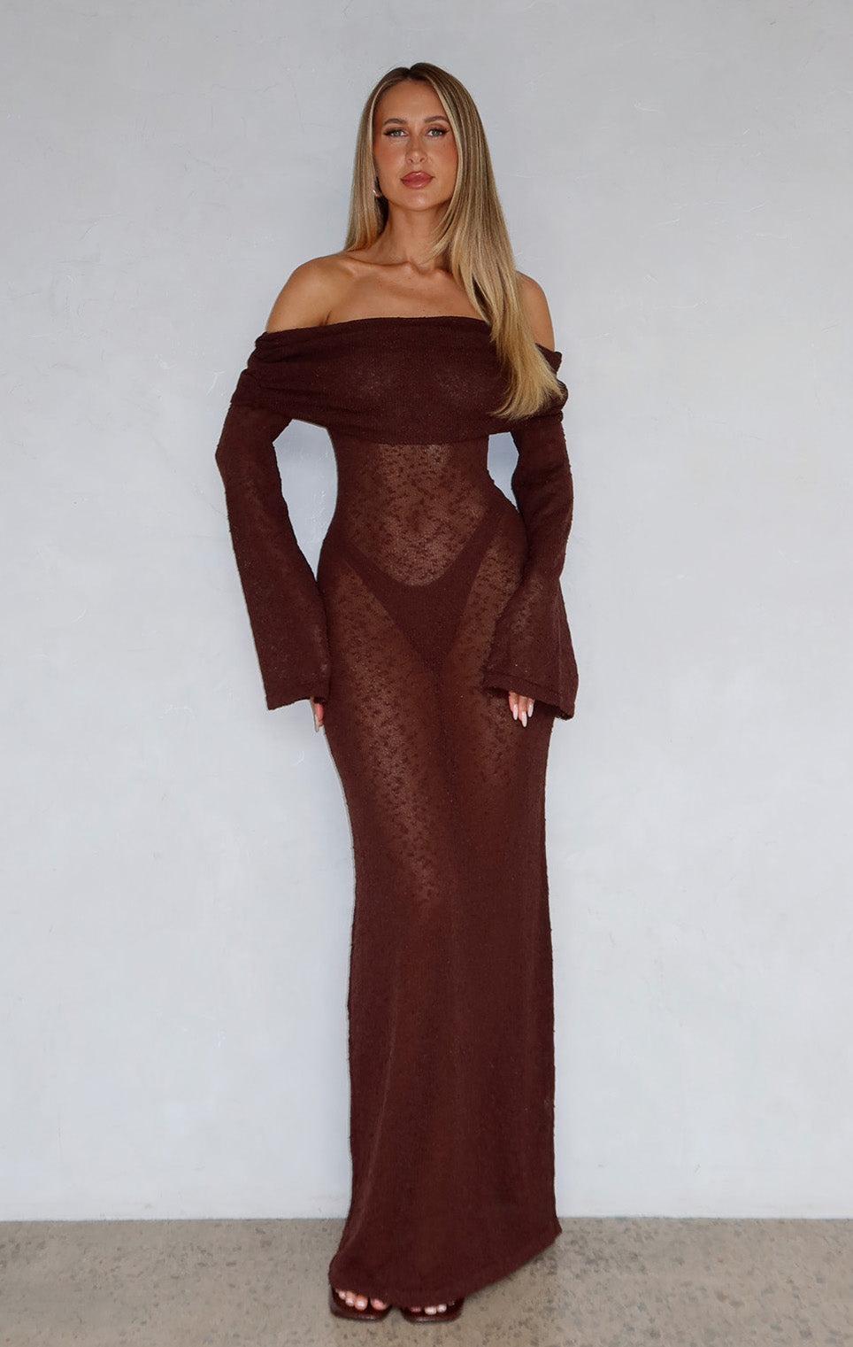 Need a dress to impress? We've got you covered. The Made It Out Long Sleeve Boucle Maxi Dress Chocolate features an off the shoulder design with a fold over detailing and bust grip tape, unlined bodice, maxi length, slightly sheer and stretch material for an easy slip on design. 100% Polyester Em is 170cm & is wearing an XS Ash is 166cm & is wearing an XS Please note undergarment is not included