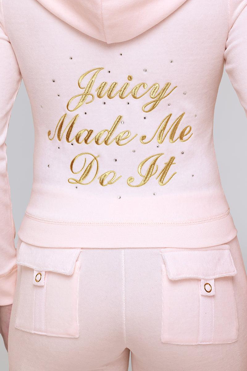 Soft, plush, and full of attitude—this cotton velour hoodie brings signature Juicy energy. Finished with a bold “Made Me Do It” detail on the back, it’s the perfect mix of comfort and playful confidence.