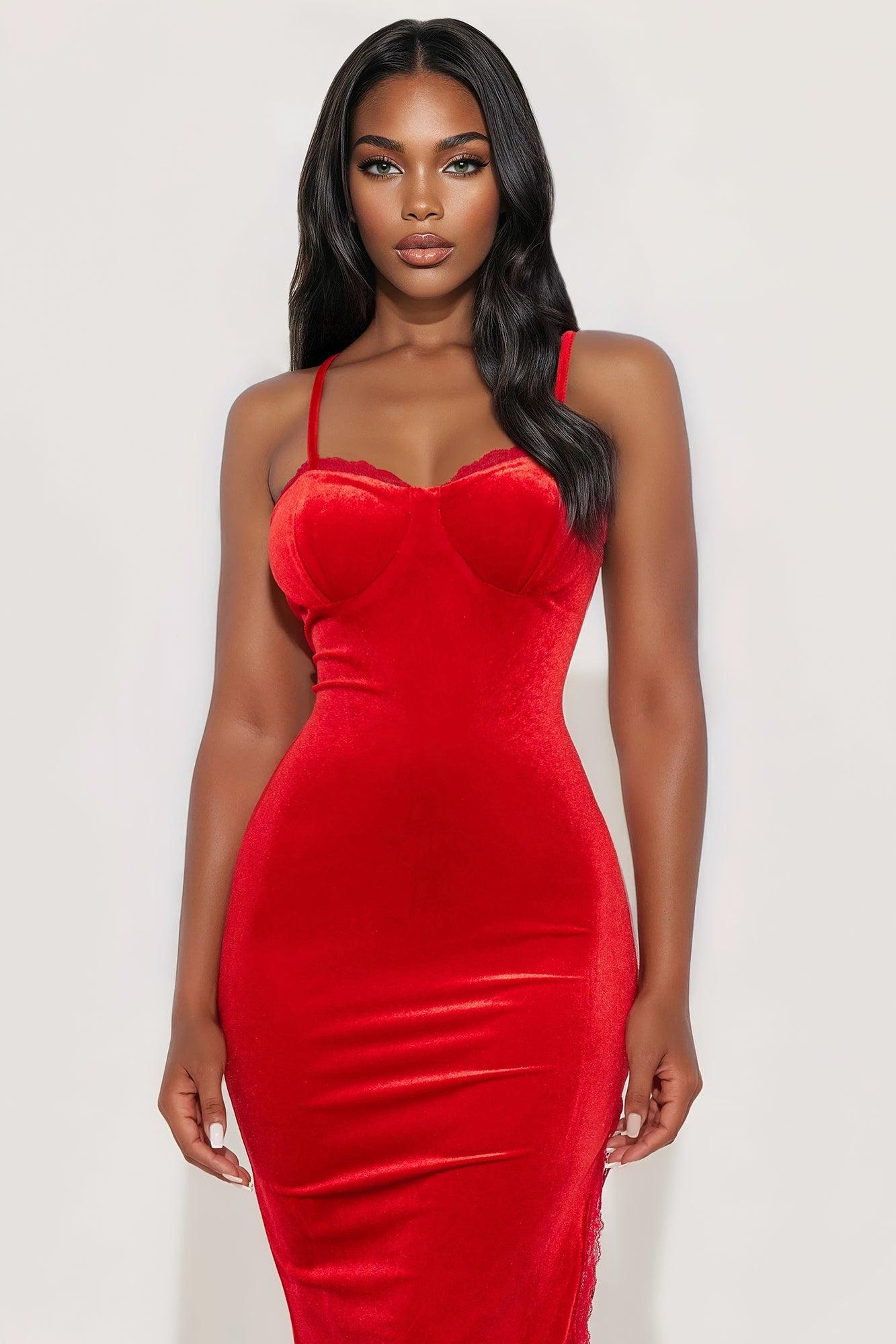 Available In Red. Velvet Midi Dress Sweetheart Neckline Adjustable Spaghetti Straps Lace Trim Bra Cup Side Slit Stretch Length Measured Flat = 49" Self: 92% Polyester 8% Spandex Imported