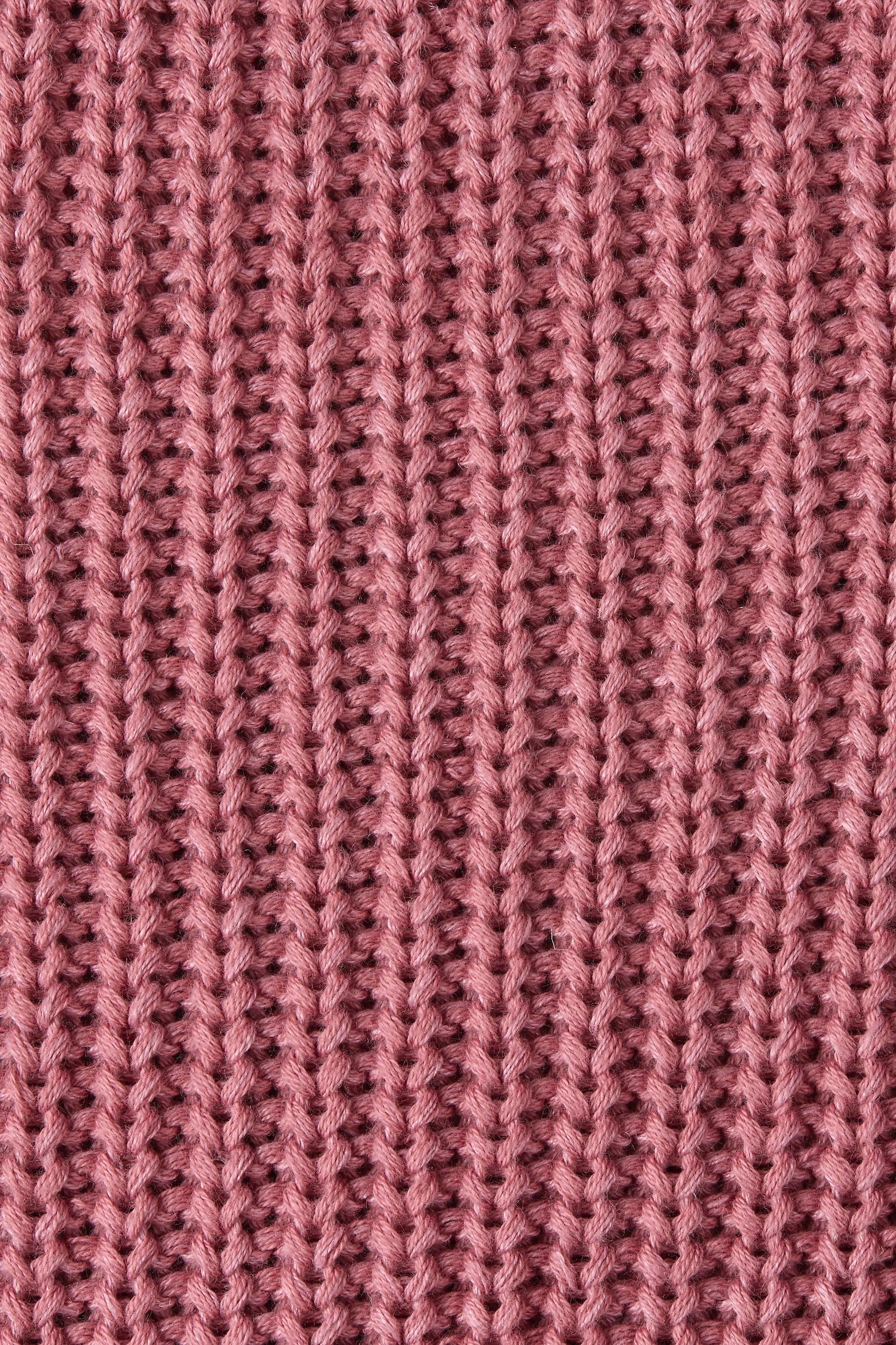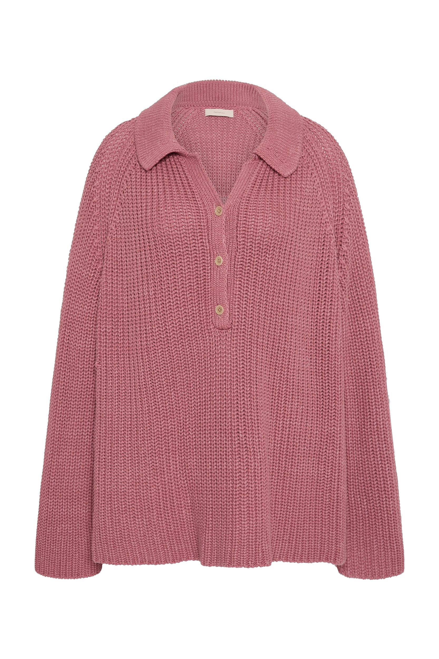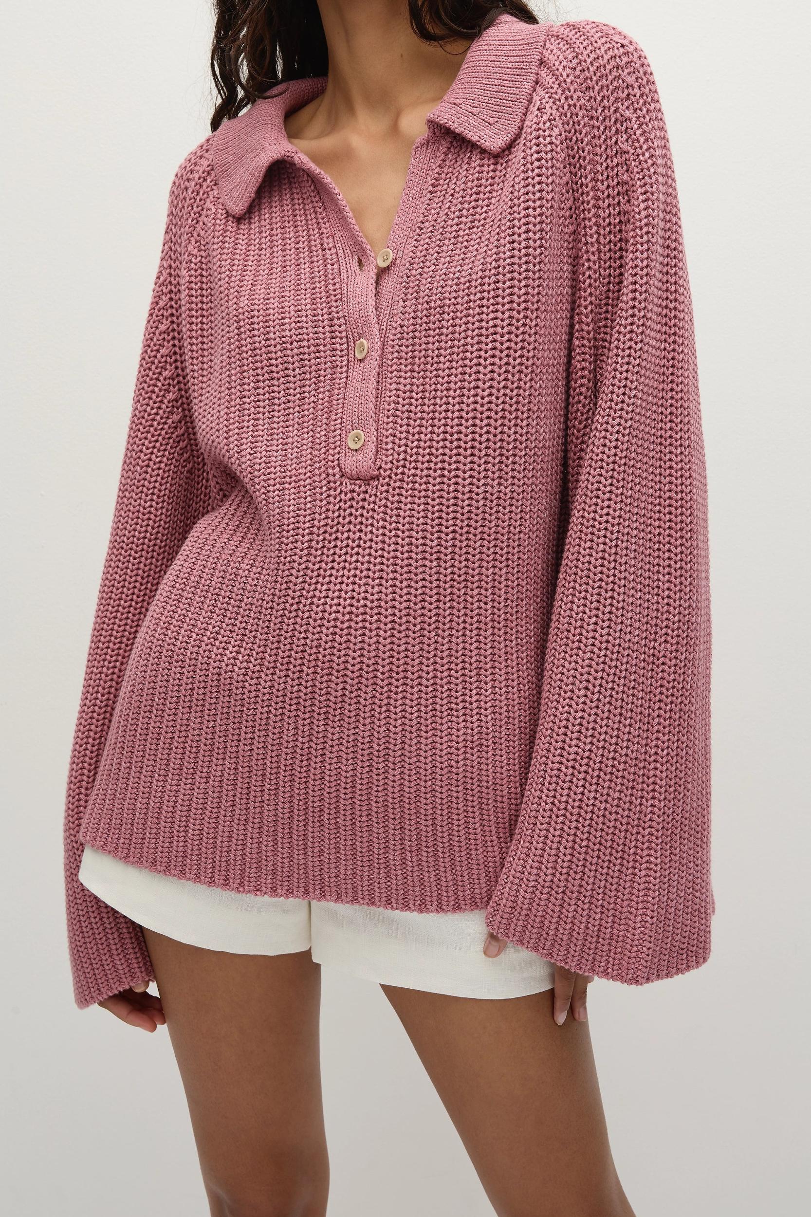 An oversized knit-style jumper with a polo-inspired neckline and collar, featuring small button details down the front. Designed from a unique knitwear fabrication, blending 100% organic cotton and European Flax® linen, it is intended to be a larger fit with long flared sleeves and a wide hem. Offered in a soft valentine pink, style over swim for crisp early morning swims or throw over your shoulders on cool summer evenings. This style is oversized. It is intentionally designed to offer an oversized silhouette. Should you prefer a slimmer fit, it is recommended sizing down.