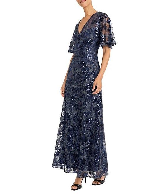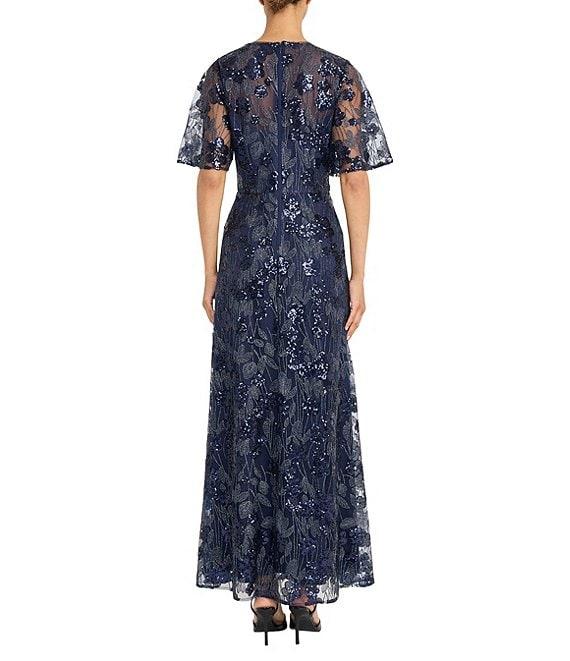 Maggy London Flutter Sleeve Embroidered Mesh Gown