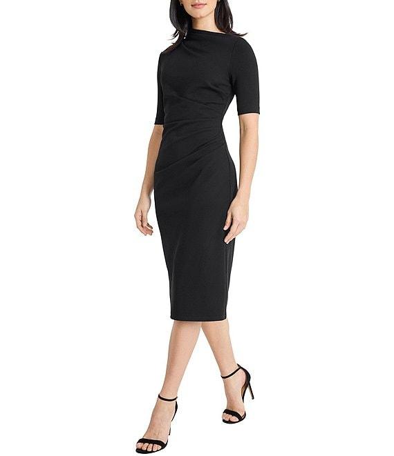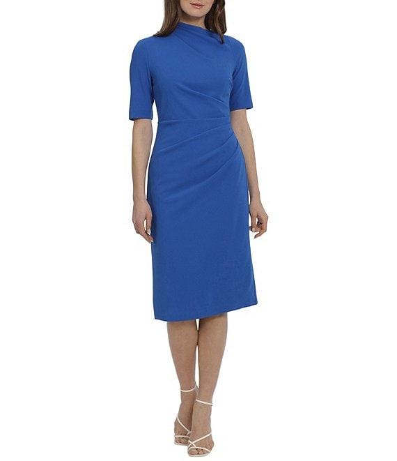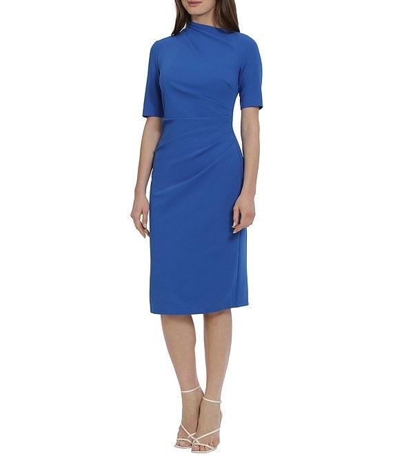 From Maggy London, this dress features: scuba crepe fabricationsheath silhouette mock necklineshort sleevesdraped midi intended to hit below the kneelined center back zip closureapprox. 46" from shoulder to hem polyester/spandexdry cleanImported.