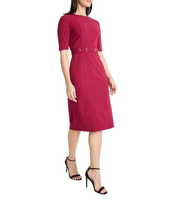 Maggy London Scuba Crepe Half Sleeve Belted Sheath Midi Dress