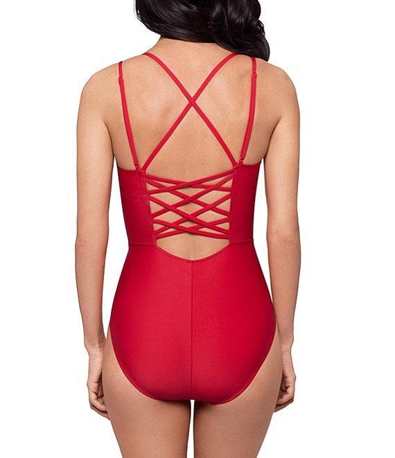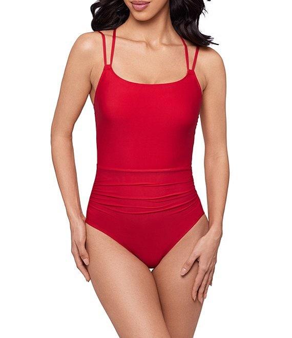 From Magicsuit, this one piece swimsuit features: Tank silhouette Scoop neckline Hidden underwire Strappy back detail Shirring bodice conceals tummy Provides allover slimming & shaping Moderate leg cut Moderate coverage Fully lined Pull-on construction Nylon/spandex Hand wash Imported.