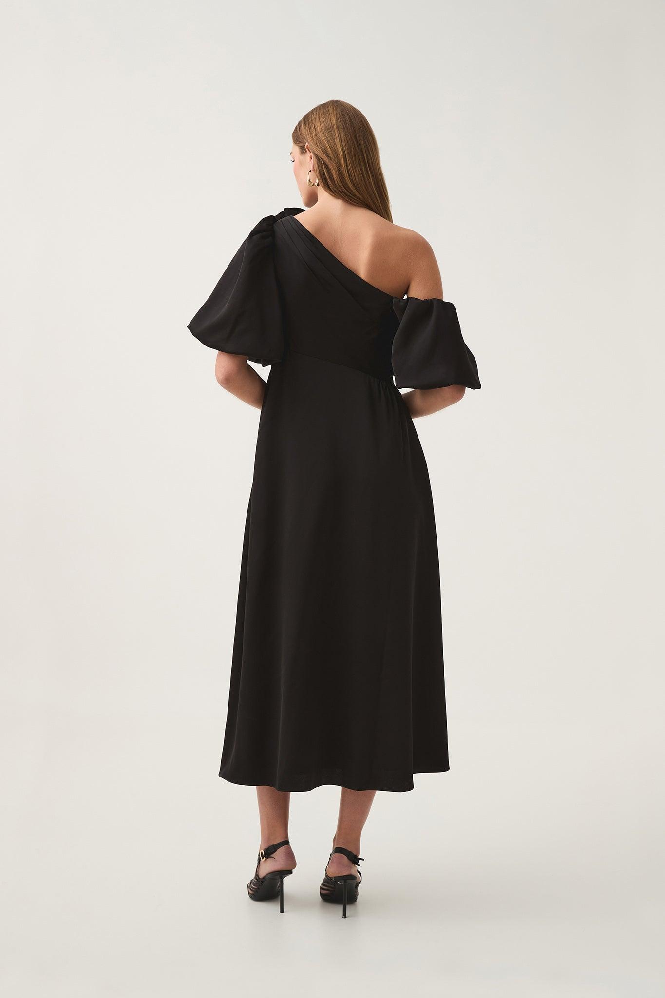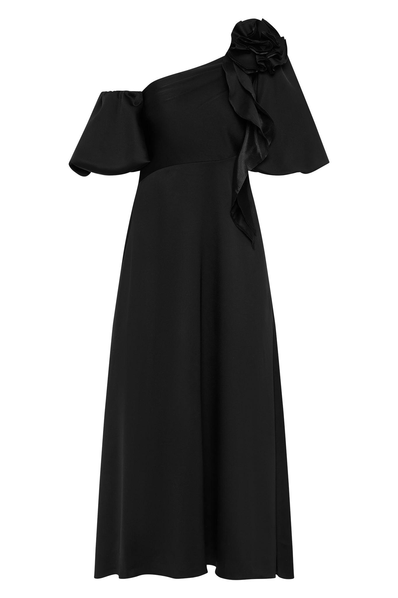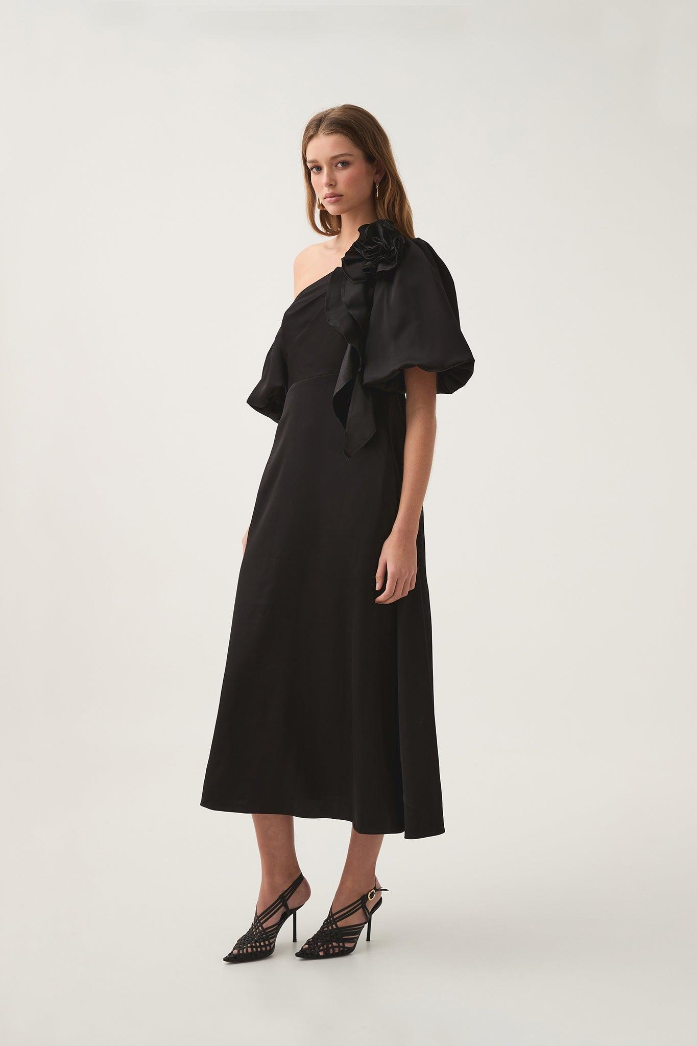 PRODUCT DETAILS Women’s midi dress Asymmetric neckline One shoulder with rosette detail Voluminous sleeves Gathered fitted bodice Side pockets Zip, hook and eye closure Lined style Shop All Dresses SIZE AND FIT Model wears a size 8/S Model: 181cm/ 5'11 Bust: 81cm Waist: 62cm Hips: 92cm FABRICATION Main: 84% Acetate 16% Polyester Lining: 100% Polyester