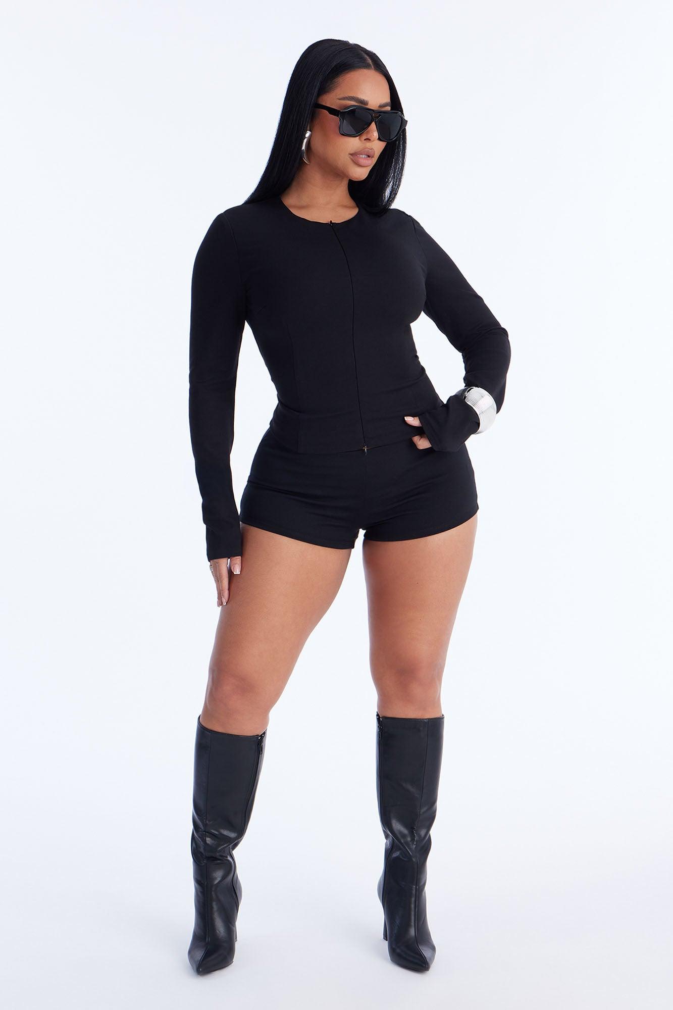 Available In Black, Coco, Taupe And White. Top Crew Neck Long Sleeve Zipper closure Stretch Self: 63% Rayon 32% Nylon 5% Spandex Lining: 100% Polyester Imported California Proposition 65WARNING: Cancer and Reproductive Harm - www.P65Warnings.ca.gov.
