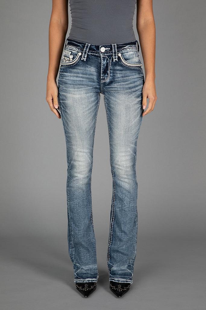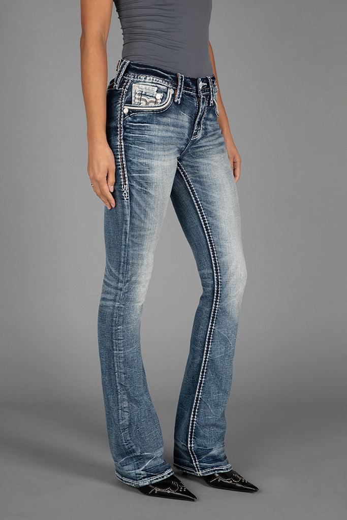 Maisie Bootcut Jeans by Rock Revival with a bootcut silhouette crafted in a medium wash, designed in Los Angeles. Premium stretch denim for comfort and durability Signature inverted Fleur-de-Lis embroidery Custom pewter hardware and rivets Engraved 'Rock Revival' leather waist patch