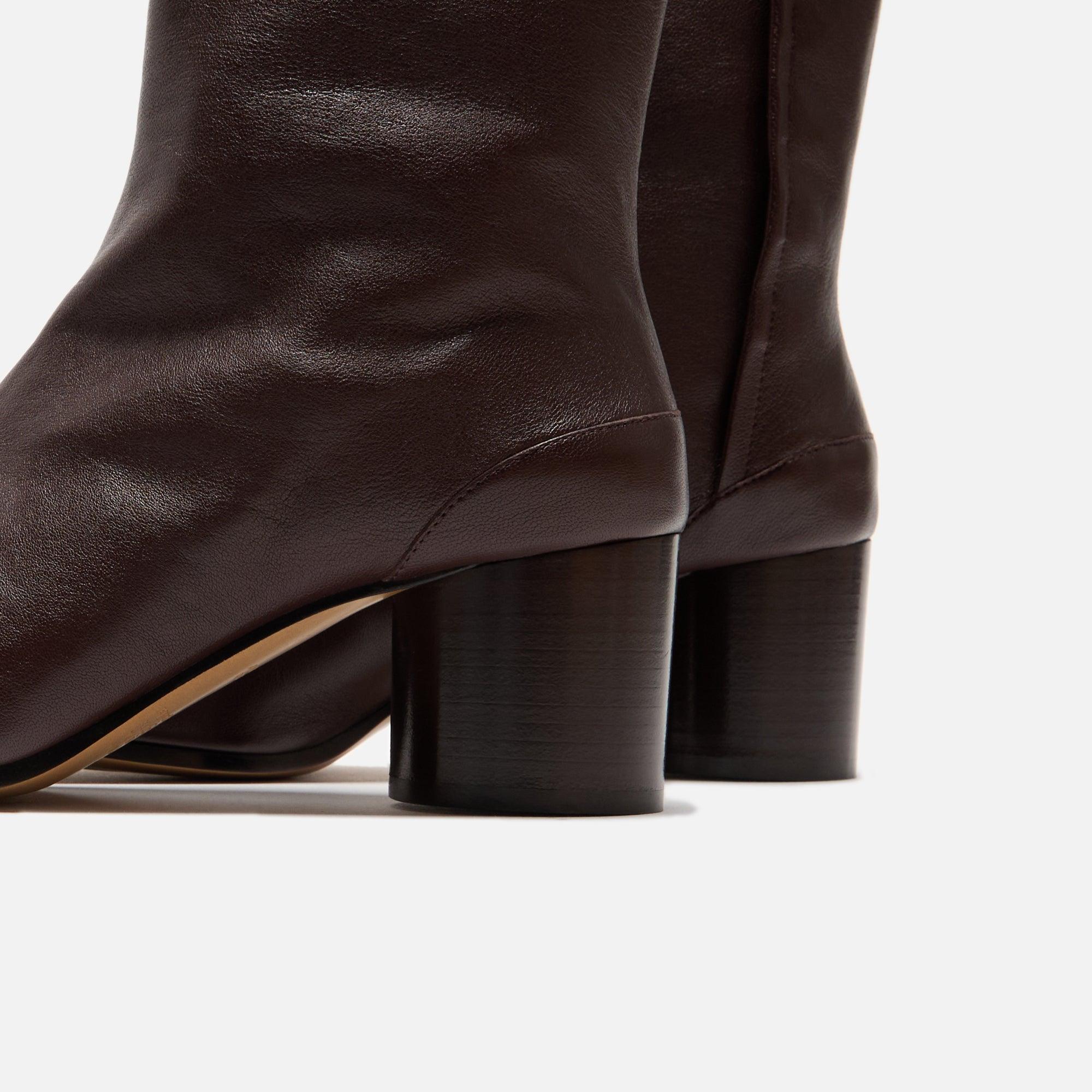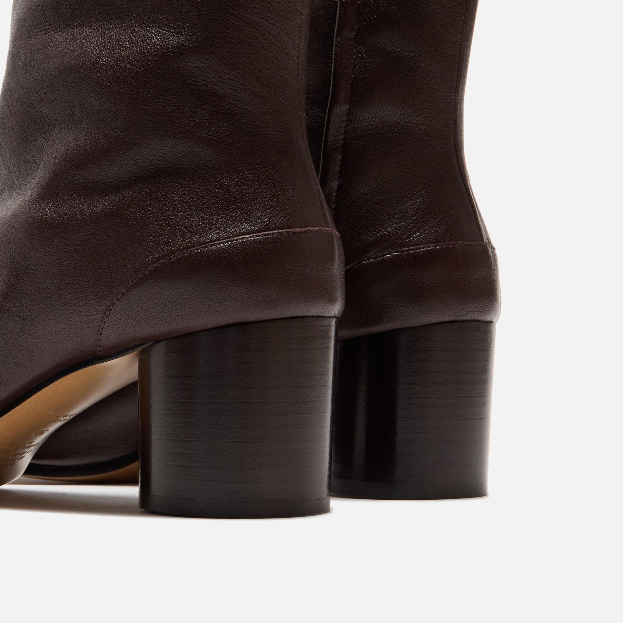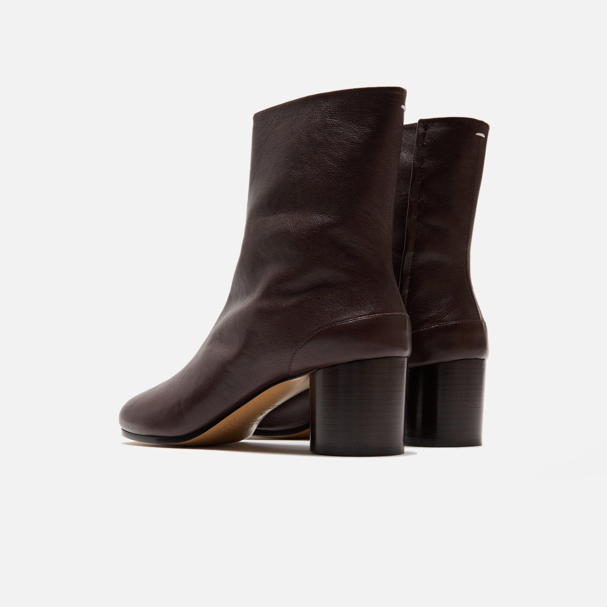 Tabi Ankle Boot silhouette Nappa leather upper Lambskin leather lining Split-toe Hook and loop closure on ankle Signature Margiela stitching on back Cylindrical heel Rubber contrast Calf leather outsole Heel height: 3" Style: s58wu0246p3753t2264 Color: Chic Brown Material: Nappa Leather