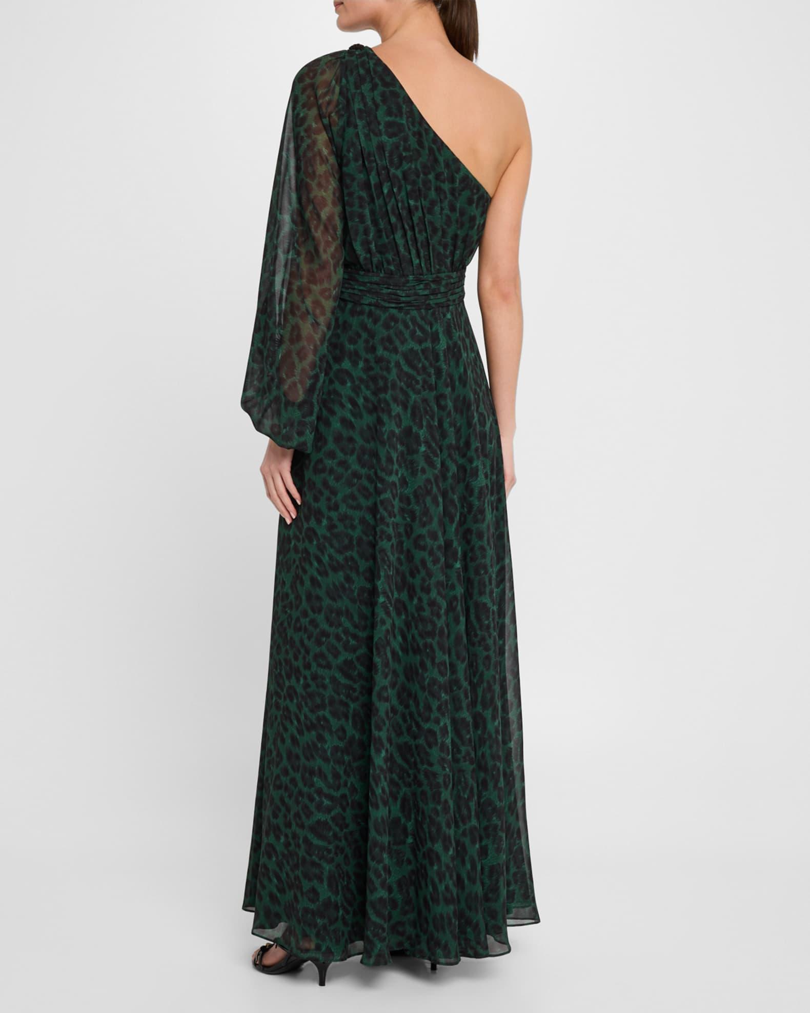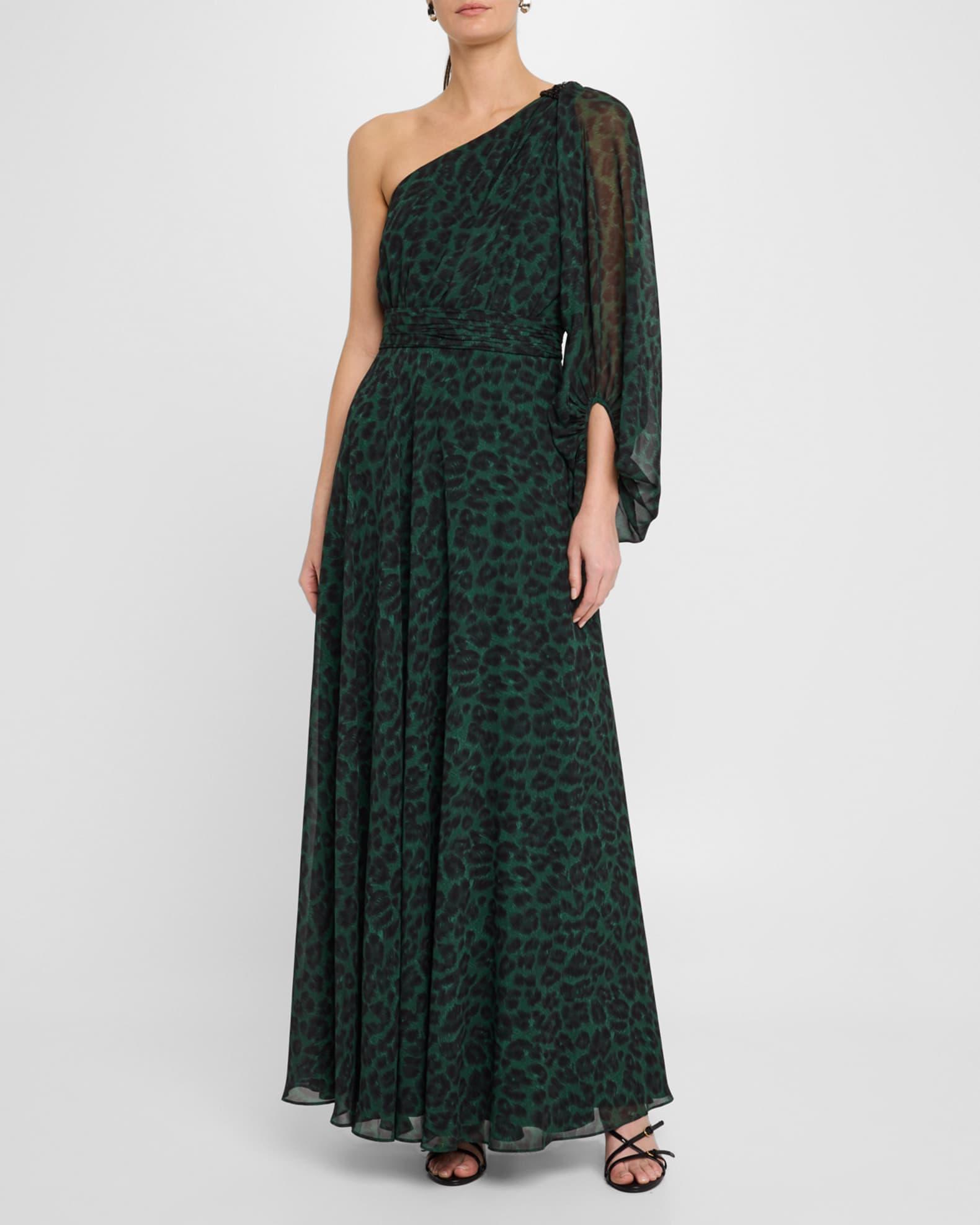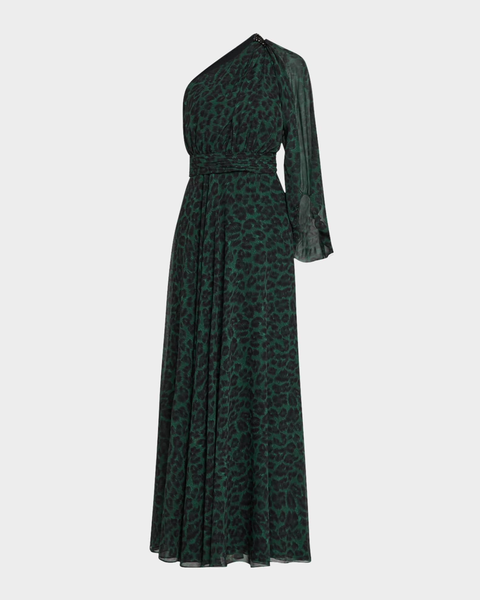 Sachin & Babi "Makayla" gown in leopard-print chiffon features a crystal-embellished broach detail Approx. 60"L from shoulders to hem One-shoulder neckline Long balloon sleeve Ruched waistband Full length A-line silhouette Invisible side zipper Polyester Imported