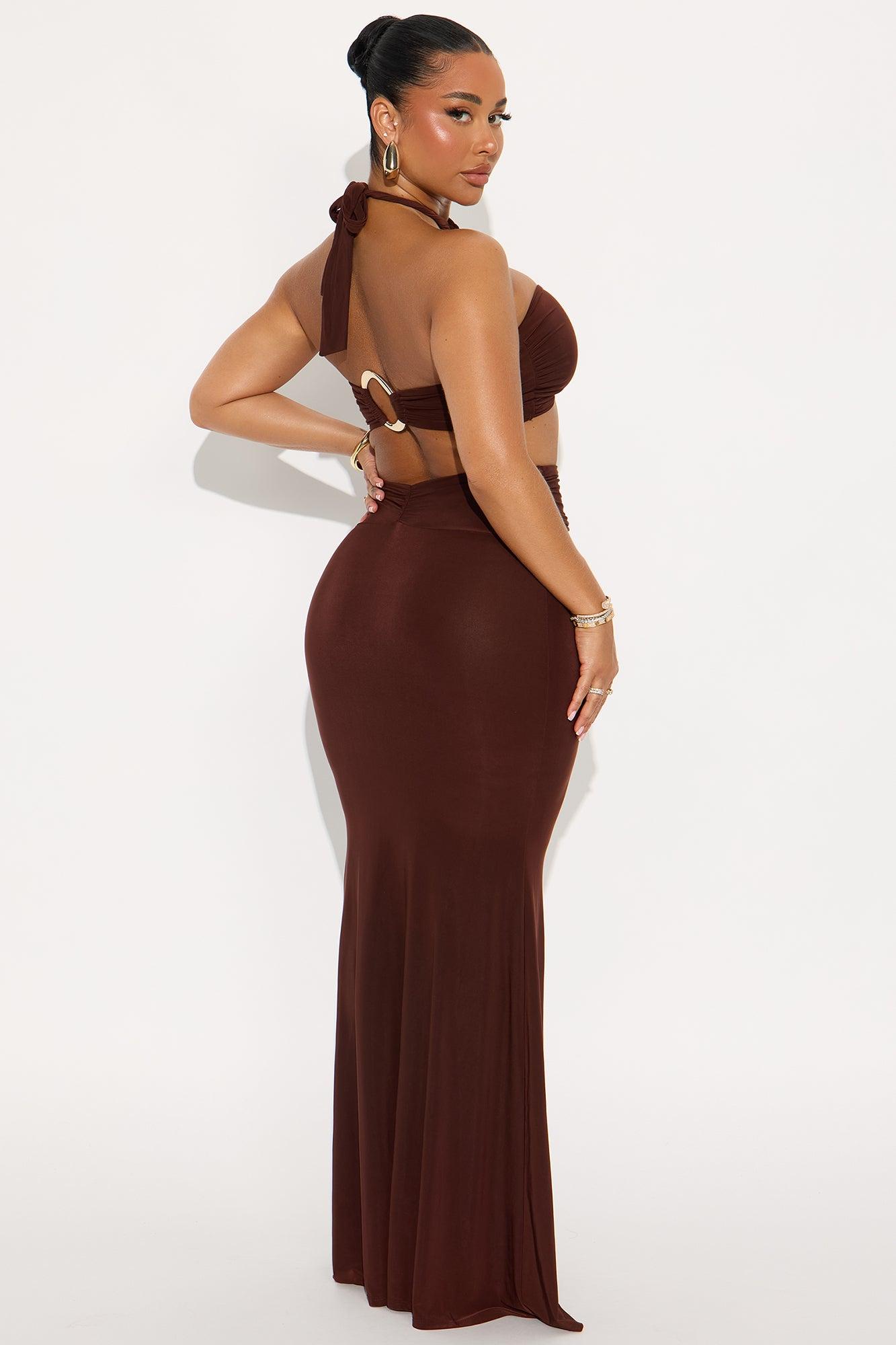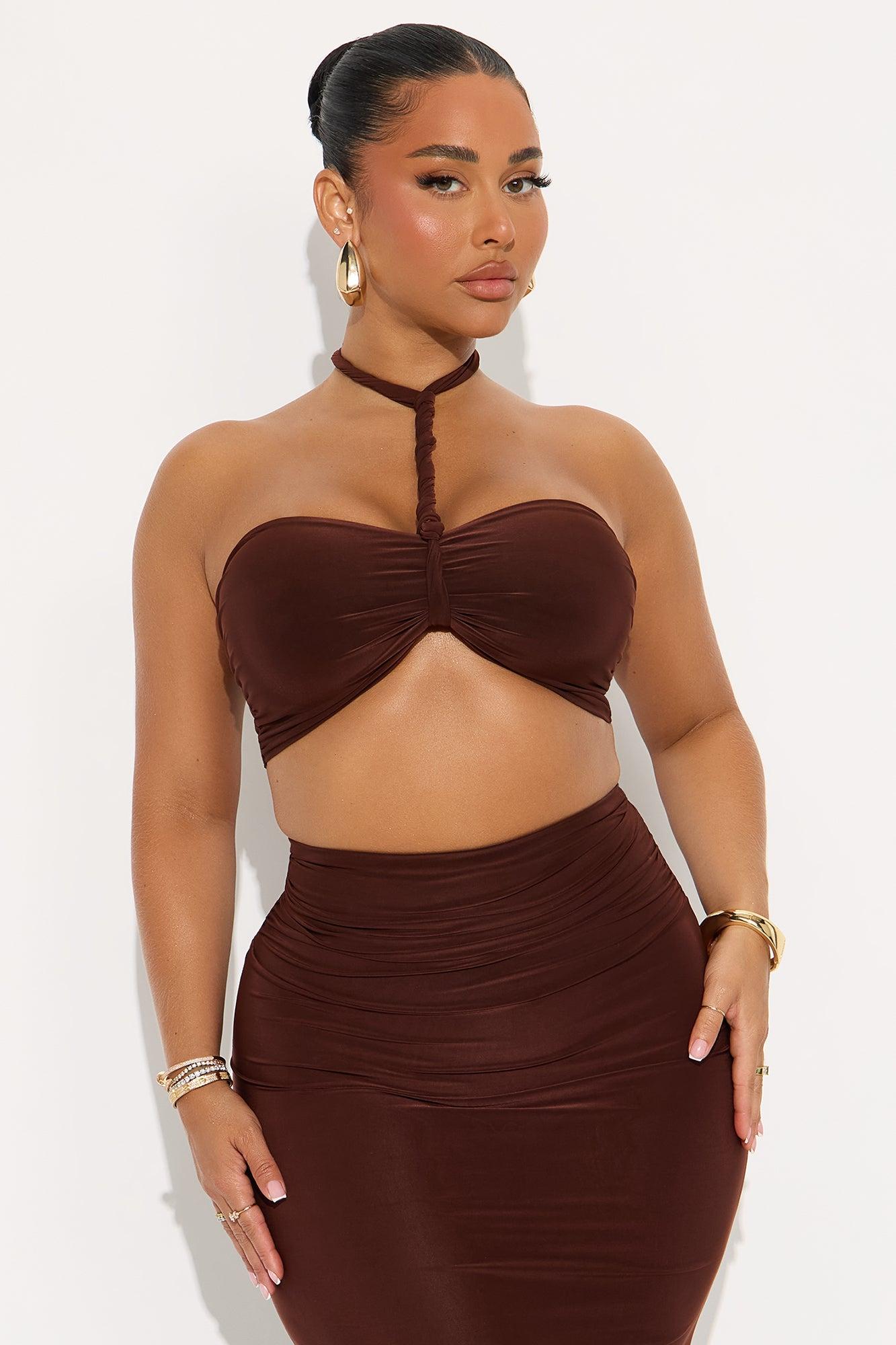 Available In Brown And Tomato Red. 2 Piece Ensemble Halter Tie Bra Top And Maxi Skirt Set Stretch Double Lined Top Elastic Front Waistband On Skirt Self: 96% Polyester 4% Spandex Prop65-Y Imported California Proposition 65WARNING: Cancer and Reproductive Harm - www.P65Warnings.ca.gov.