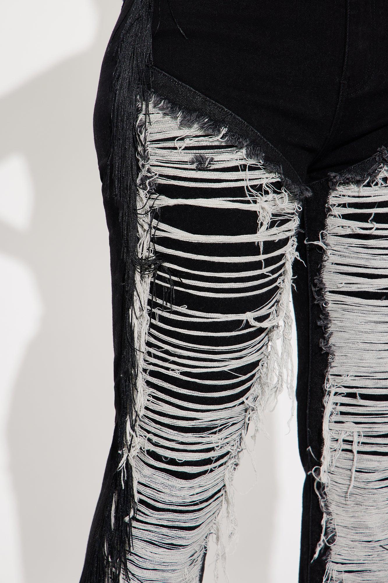 Available In Black Wash. Straight Leg Jean 5 Pocket Ripped Fringe Detail 11.5" High Rise 34" Inseam Non Stretch Disclaimer: Due To The Specialized Wash & Distressing Process, Each Garment Is Unique. Self: 98% Cotton 2% Spandex Contrast: 100% Cotton Imported California Proposition 65WARNING: Cancer and Reproductive Harm - www.P65Warnings.ca.gov.