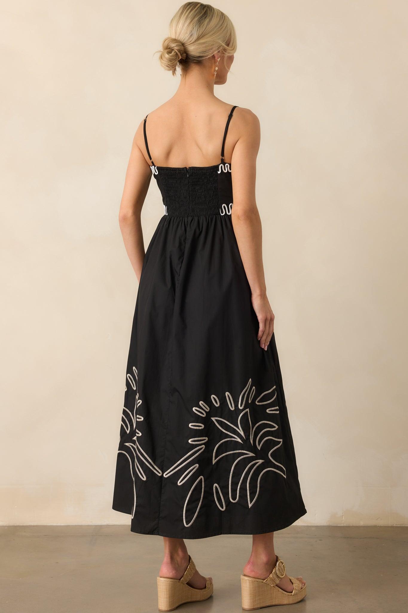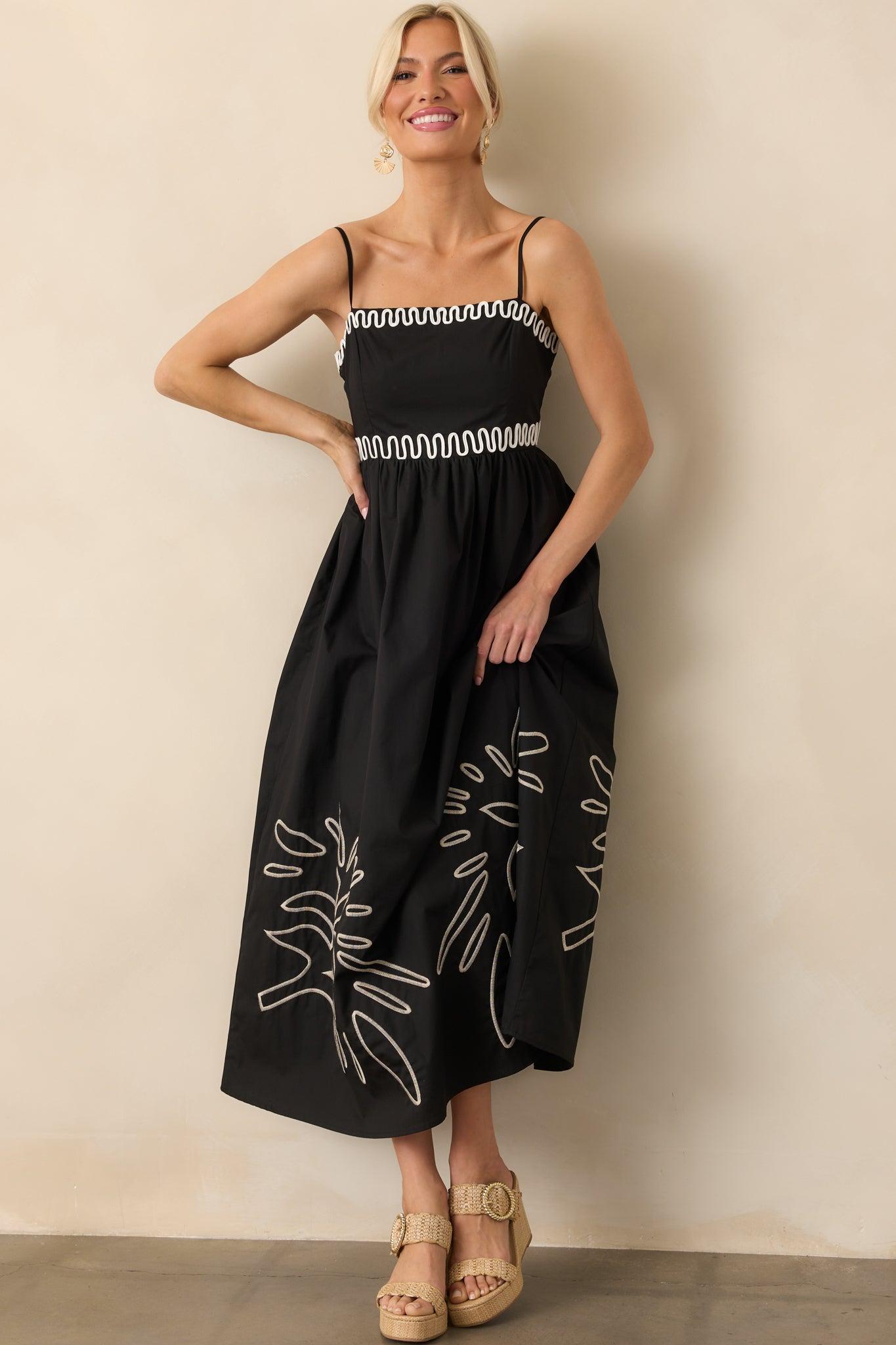 The Makes Perfect Sense Black Cotton Embroidered Maxi Dress is great for days when you want to feel stylish without going over the top. With its relaxed elegance and thoughtful details, it’s a versatile pick for casual dinners, weekend outings, or simply enjoying the day in something special. This black maxi dress features a square neck, adjustable spaghetti straps, back smocked panel, hidden back zipper closure, white contrast squiggle trim on the bodice, ivory embroidered abstract floral details, and full black lining. 100% Cotton Contrast: 95% Polyester & 5% Spandex Lined: 100% Rayon Hand Wash Cold Manufactured in China Designed in The USA Model is 5'6 and Wearing a Size Small