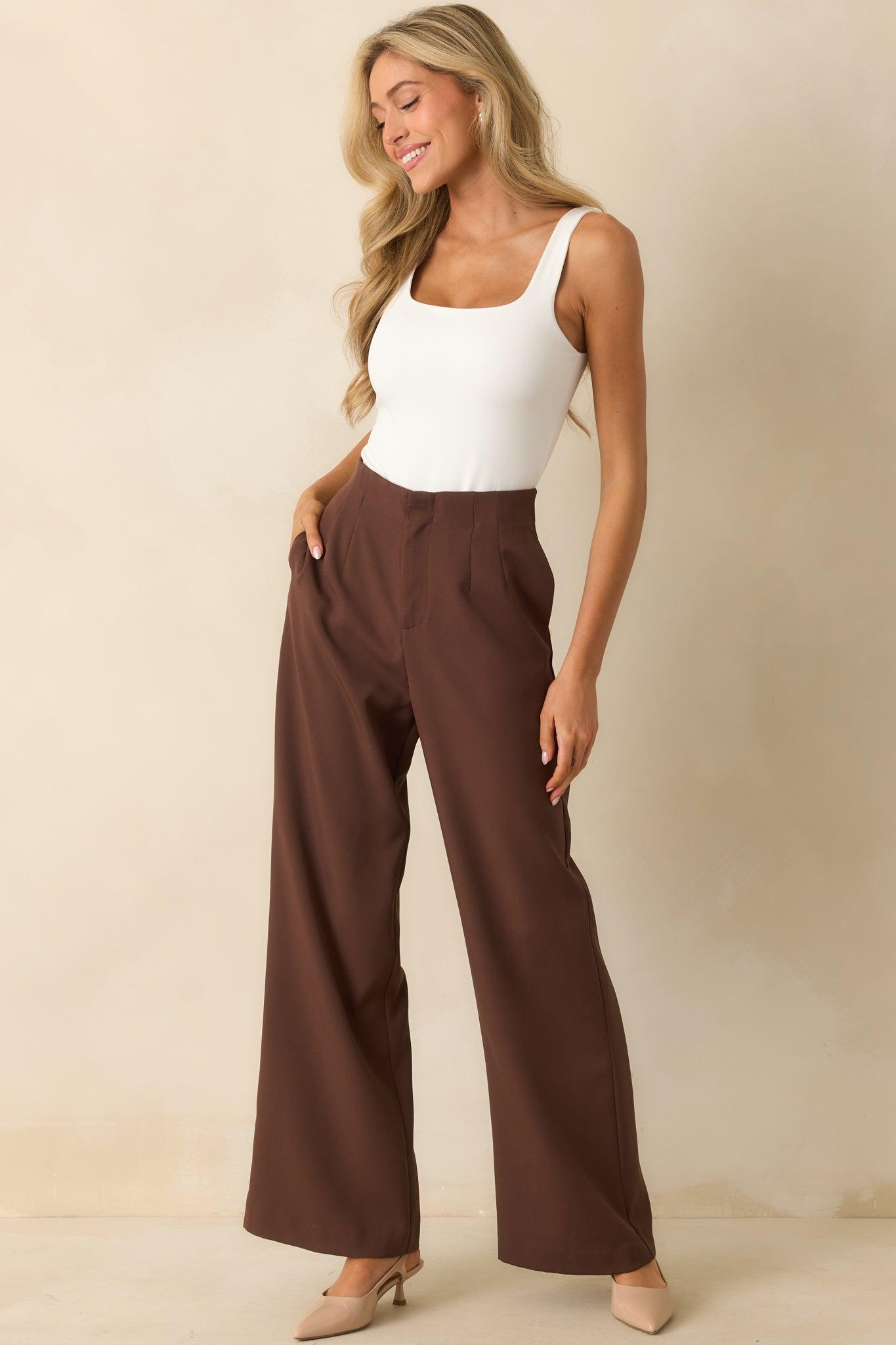 The Making A Change Chocolate Brown High Waisted Wide Leg Pants are your sign to switch things up. They’re sleek, flattering, and bring that effortless kind of polish that works any day of the week. These chocolate brown pants feature a high rise waist, a hook and bar closure, functional zipper, pleated leg design, and functional side pockets. 96% Polyester & 4% Spandex Unlined Hand Wash Cold Manufactured in China Designed in The USA Model is Wearing a Size X-Small