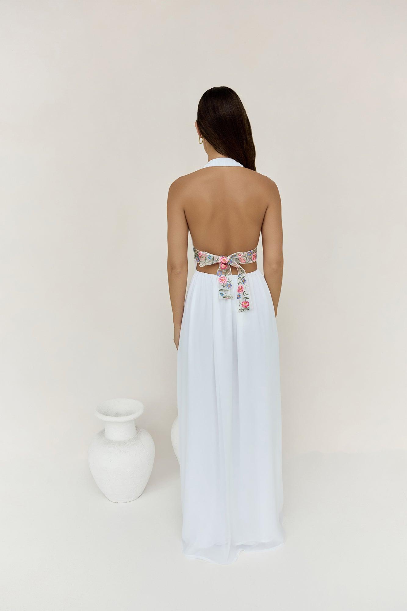 Say hello to effortless elegance in the Maldives Garden Halter Maxi Dress – featuring a halter neckline with elastic comfort, delicate embroidery at the waist, an airy flowy skirt, and an open tie-back with a soft elastic finish and a flirty skirt split. Just add gold hoops and sandals for the ultimate garden party glow.
