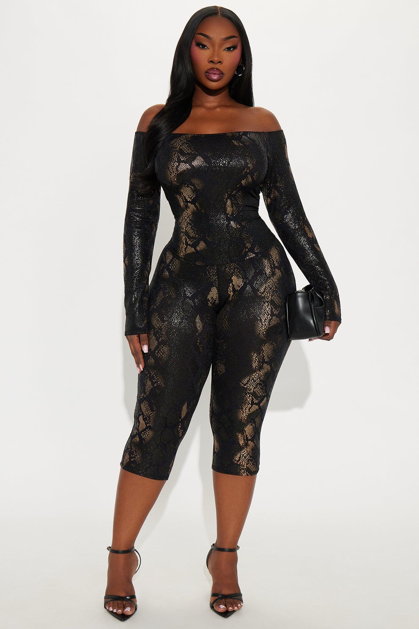 Available In Black. 2 Piece Ensemble Off Shoulder Top And Cropped Legging Pant Stretch 19.5" Inseam Elastic Waistband 85% Nylon 9% Metallic Yarn 5% Spandex Imported California Proposition 65WARNING: Cancer and Reproductive Harm - www.P65Warnings.ca.gov.