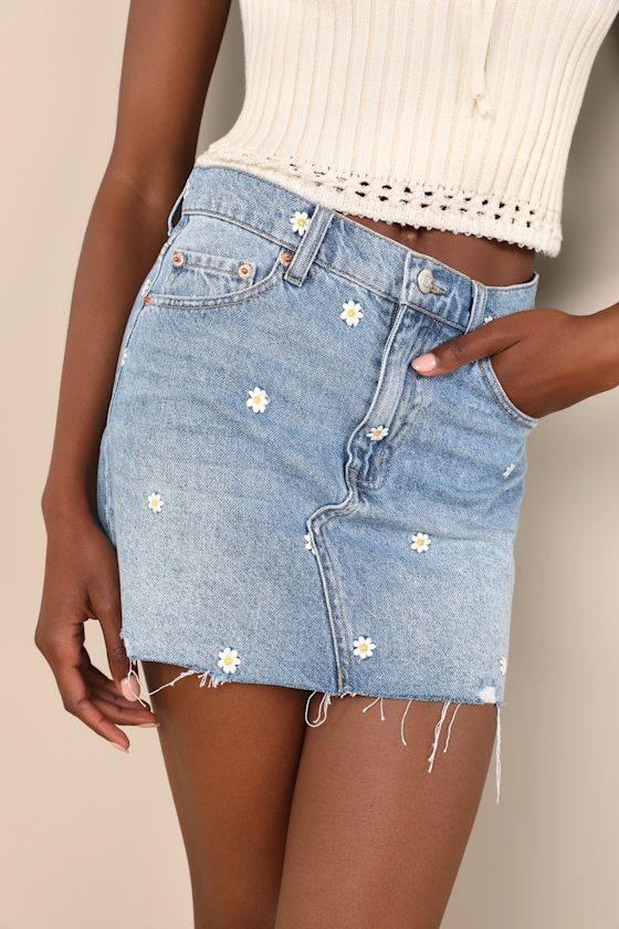 The perfect summer day includes soaking up some sunshine while you flaunt this too-cute denim skirt by DAZE Denim, adorned with white daisy-inspired embroidery. The high-waisted fit features belt loops, a hidden zip fly with a top button closure, and a classic five-pocket cut. A raw-cut hem lends a perfectly lived-in touch. Shadow patch and logo tag at back.