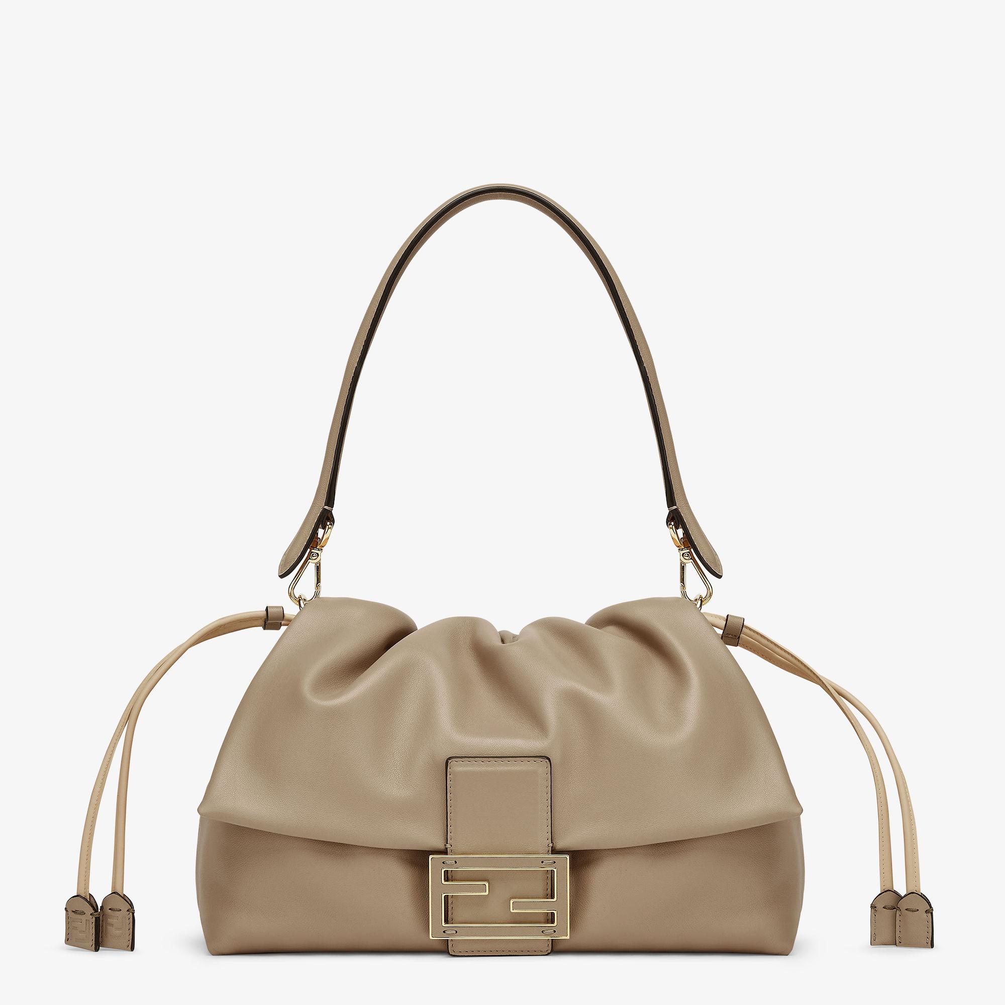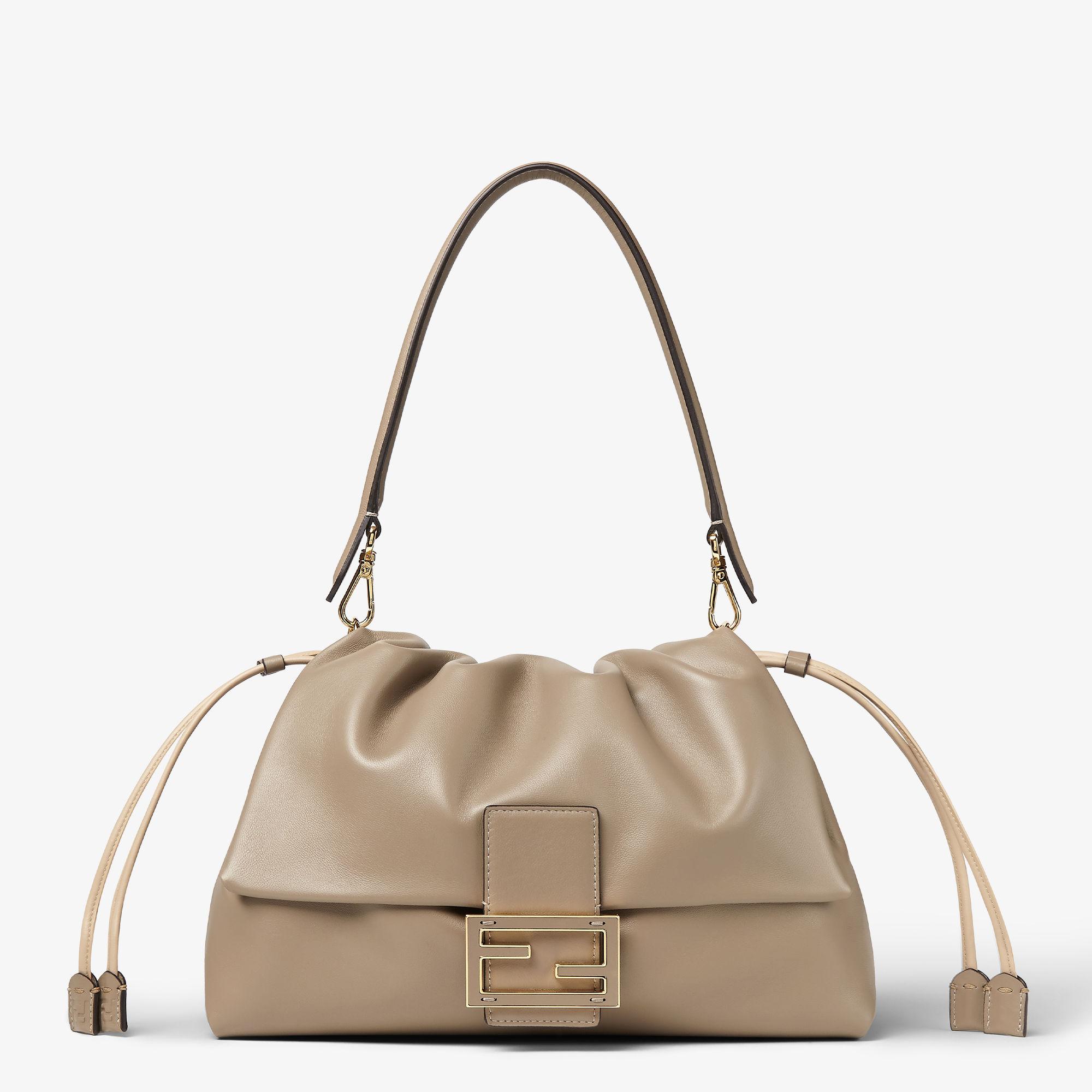 Iconic large Mamma Baguette bag, created in the late 1990s as a larger version of the iconic Baguette, hence the name Mamma Baguette. Updated for the Spring/Summer 2025 fashion show with a soft, deconstructed look, it retains the original elements of the bag and the iconic under-the-arm design. Made of soft, dove gray nappa leather embellished with an oversized metal FF clasp with tone-on-tone leather insert. Large suede-lined internal compartment with drawstring closure featuring cream-colored leather ties and customized details. Featuring a front flap and magnetic clasp. Gold-finish metalware. It can be carried on the shoulder thanks to the handle. Made in Italy