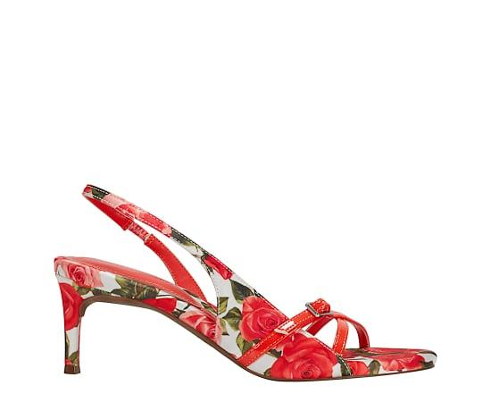 Marc Fisher Feren2 Womens Pump Red Meet spring with a beautiful bouquet like the Marc Fisher Feren2 Pump. Featuring an allover print, this Shoe has thin patent leather cross straps for a shiny contrast. The footbed soothes your foot, while the heel offers just enough lift. Fabric/synthetic upper Elastic slingback strap Allover floral print Lightly Padded footbed 2 kitten heel