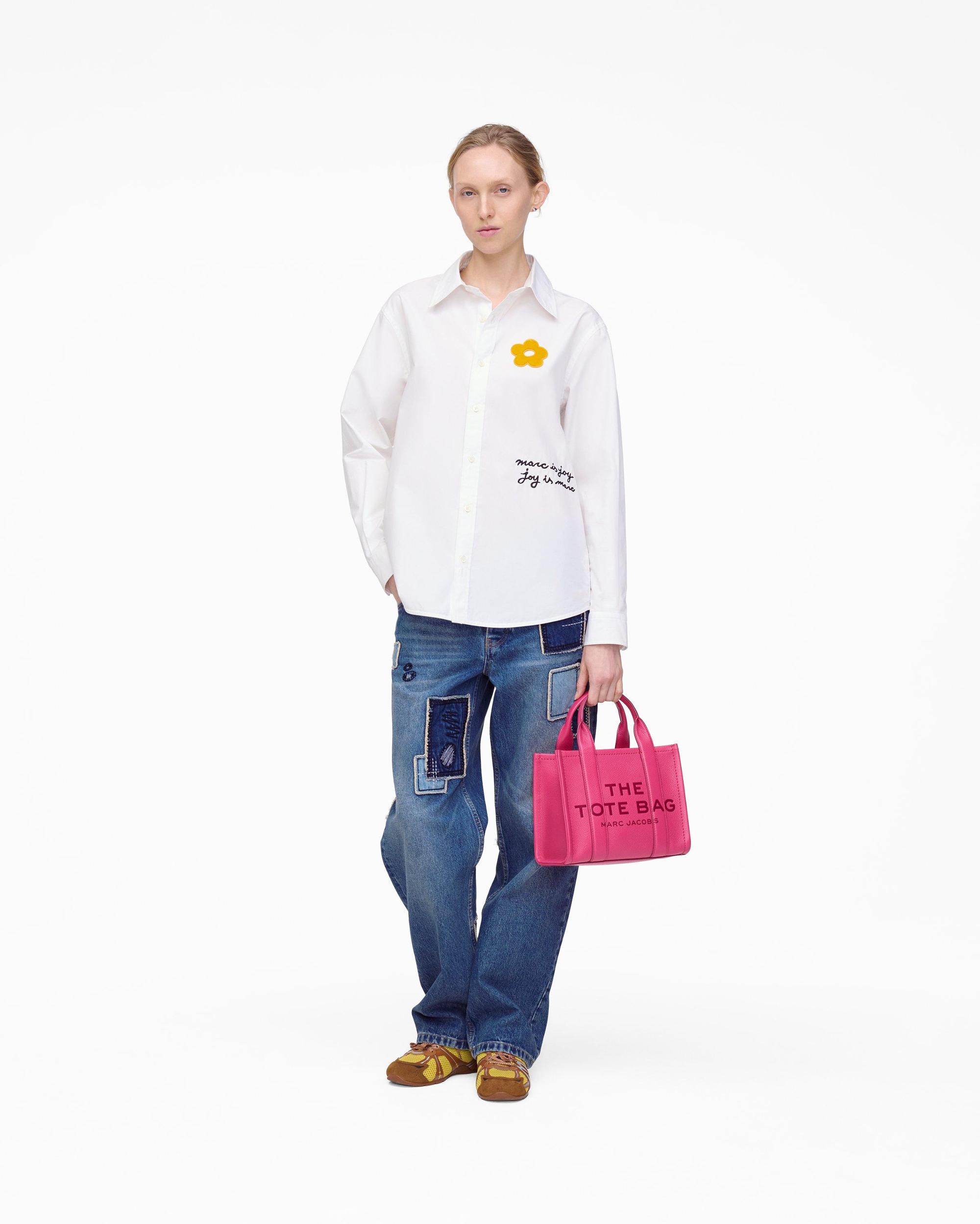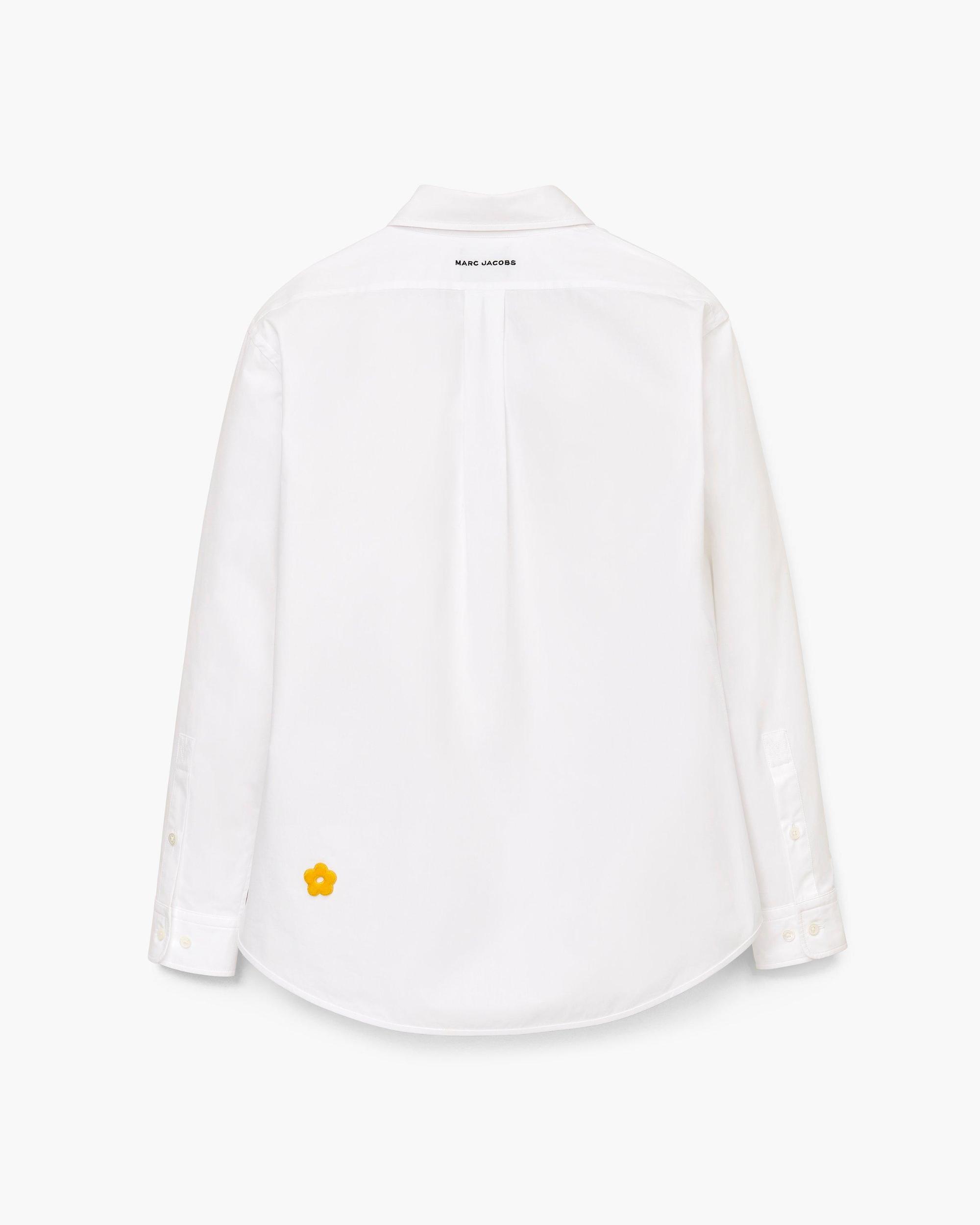 A button-up shirt crafted from 100% cotton, this pieces is adorned with flocked daisy patches and playful raised-thread embroidery that reads ‘MARC IS JOY.’ Our signature script logo accents the chest, while subtle ‘MARC JACOBS’ embroidery sits just below the back collar. A box pleat at the center back adds a touch of tailored structure to this fresh, joyful staple. Shop Marc Jacobs Marc Is Joy Shirt