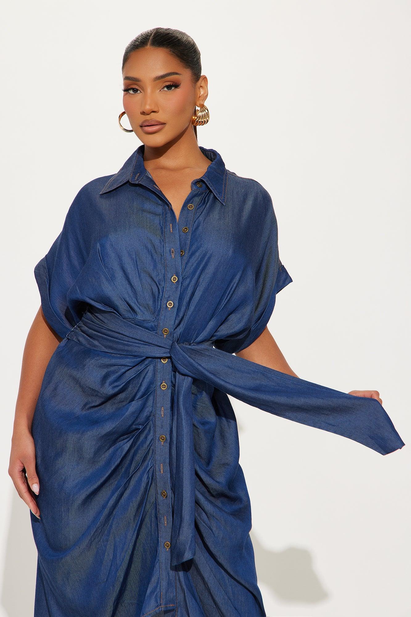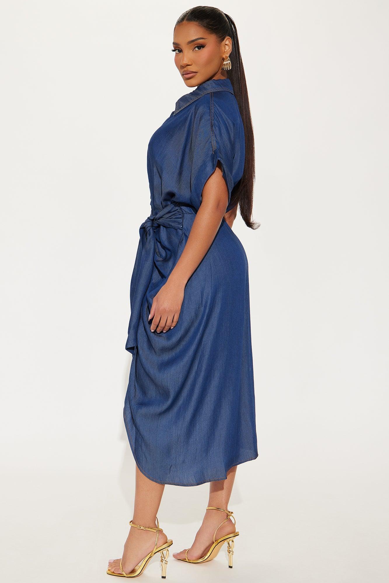 Available In Dark Wash. Chambray Midi Shirt Dress Collar neckline Short sleeves Button up Ruched Tie back Slight stretch Length = 46" Self: 100% Rayon Imported