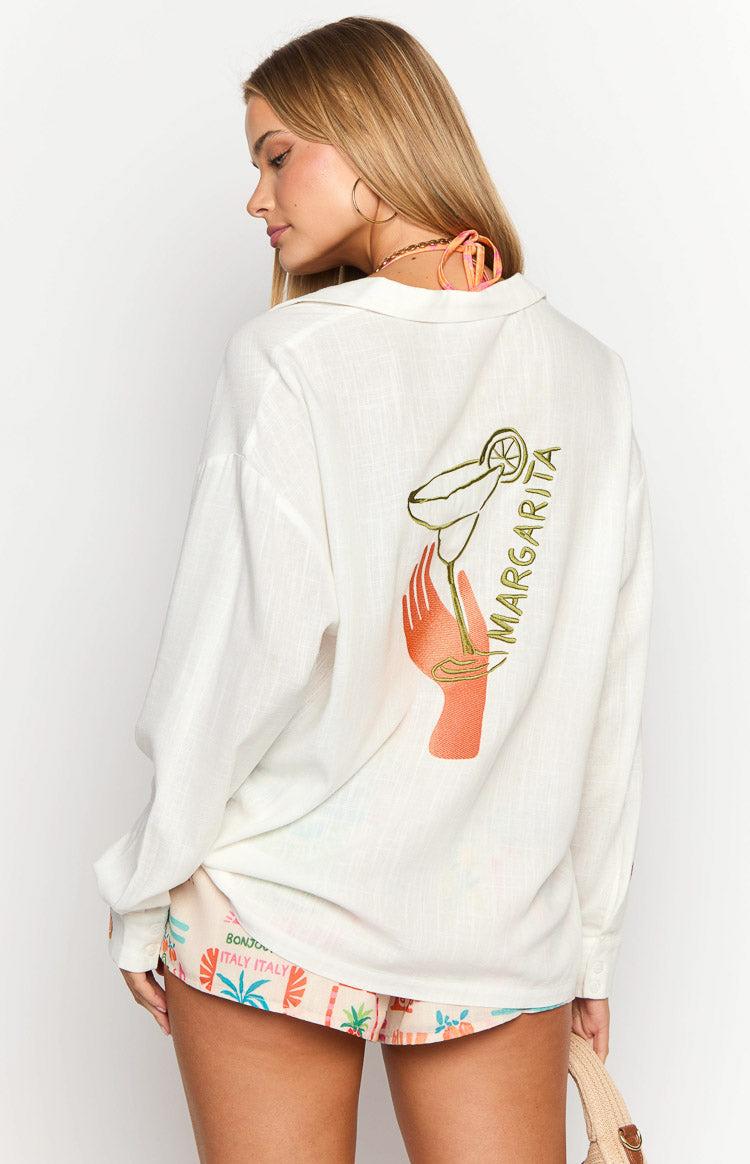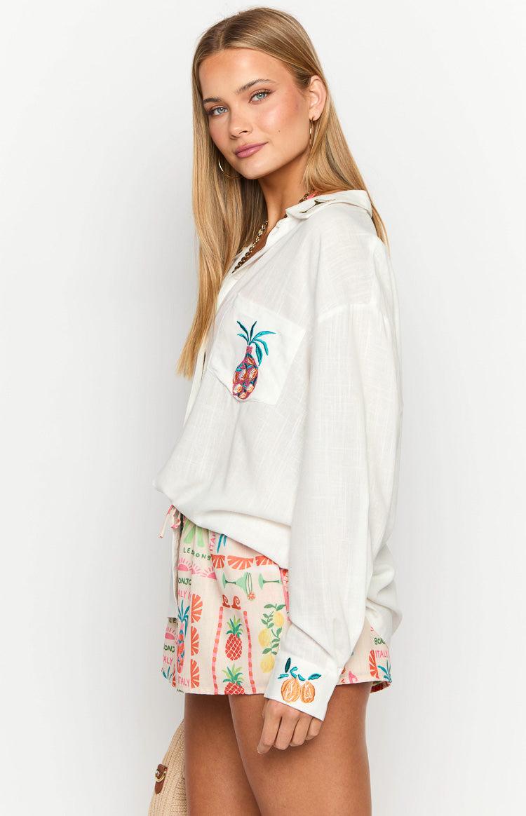White Embroidered Long Sleeve ShirtHow to style:Whether you're lounging by the beach to simply running errands, our Margarita Dolce Vita Shirt brings all the resort vibes to any look! Perfect as a beach cover up, pair this gorgeously embroidered long sleeve shirt with your fave bikini set! Add our matching Ottie Dolce Vita Print Shorts for a beach to sunset dinner vibe, finishing your look with gold jewellery and sandals.Features: Lightweight linen material Embroidered design Relaxed oversized fit Drop shoulder style Unlined Functional front pocket Button through front Cuffed sleeves with buttons Little to no stretch
