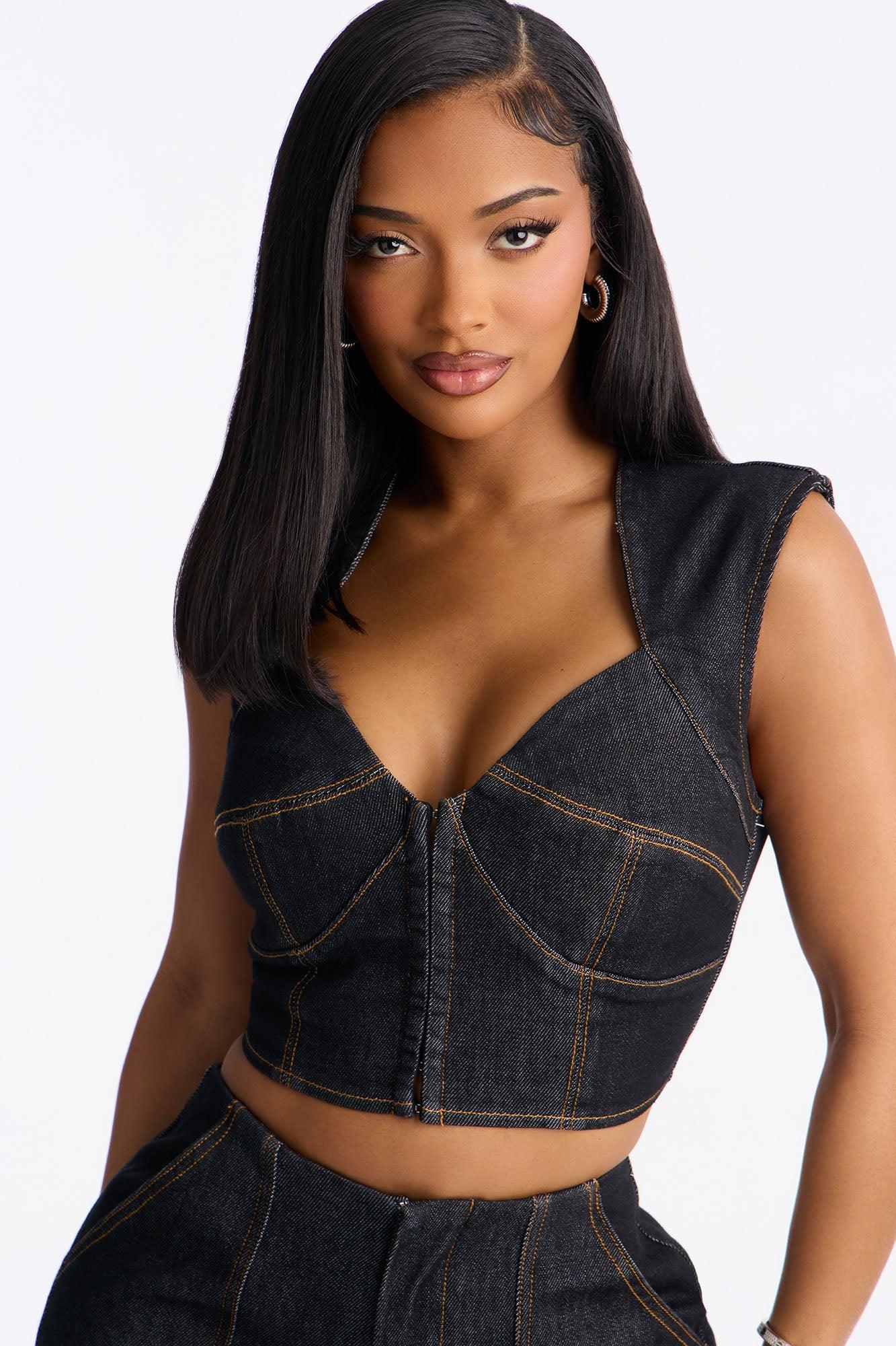 Available In Dark Wash. 2 Piece Ensemble Corset Top And Wide Leg Denim Pant Set Moderate Stretch 33" Inseam Front Clasp And Zipper Pant Closure Pockets Disclaimer: Due To The Specialized Wash, Each Garment Is Unique. Self: 62% Cotton 33% Polyester 4% Rayon 1% Spandex Imported California Proposition 65WARNING: Cancer and Reproductive Harm - www.P65Warnings.ca.gov.