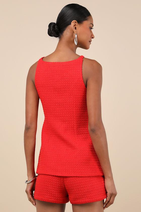 A chic and easy ensemble should always start with this vest-inspired top, featuring a knit construction and a woven-like texture across the longline silhouette. A boat-style neckline and slender straps accent the sleeveless bodice, as well as a button placket, welt pockets, and a front slit. Pair with the matching shorts for a complete look!