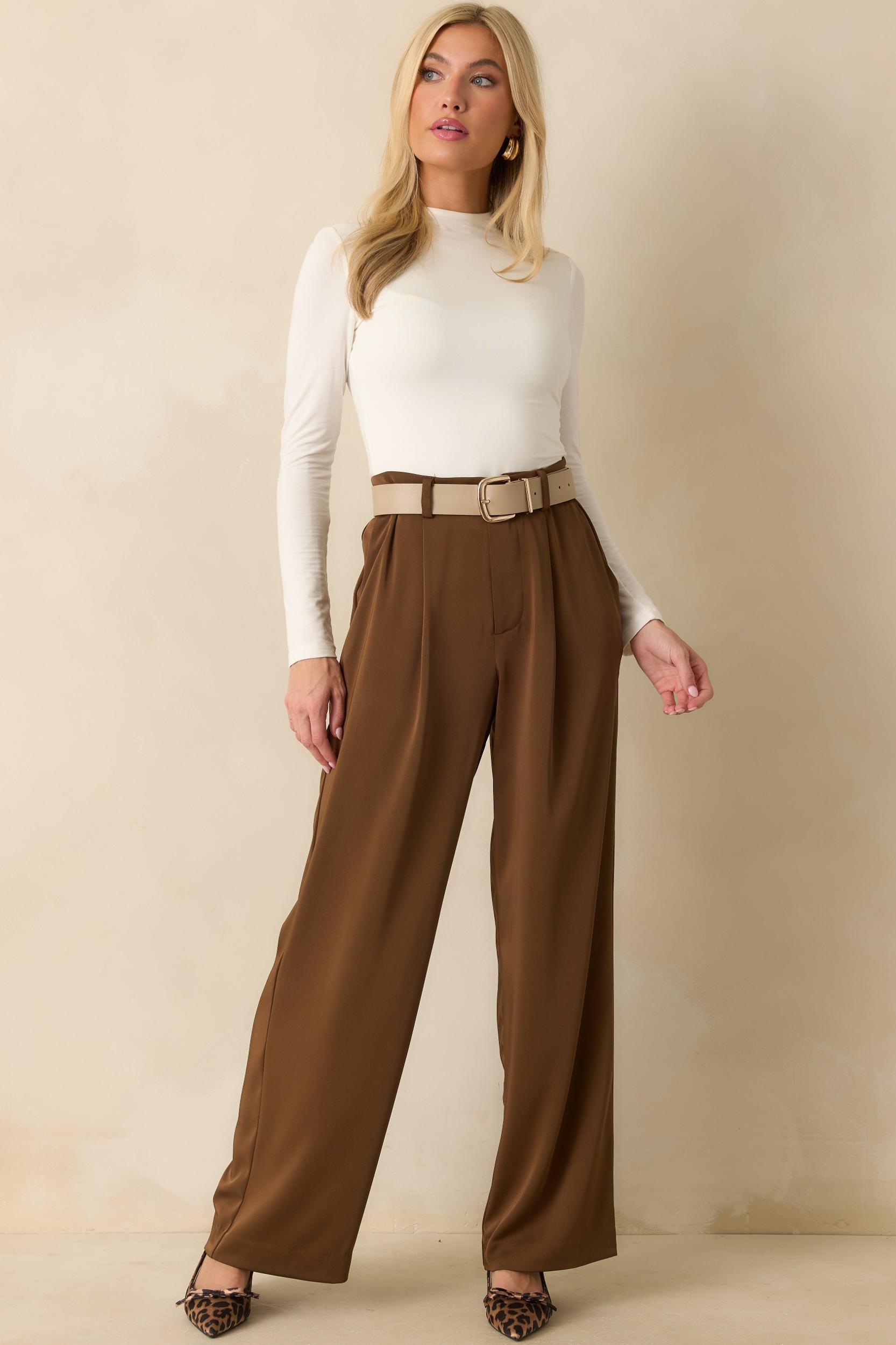 The Mark My Words Brown High Waisted Wide Leg Trousers bring a strong, confident edge to your look, giving you that polished yet modern vibe that proves some styles never go out of fashion. These brown trousers feature a high-rise waist with belt loops, a zip fly with hidden hook closure, front pleats for shape, functional side pockets, faux back welt pockets, and a wide-leg silhouette. 97% Polyester & 3% Spandex Lined: 95% Polyester & 5% Spandex Hand Wash Cold Manufactured in China Designed in The USA Model is 5'8" and is Wearing a Size Small