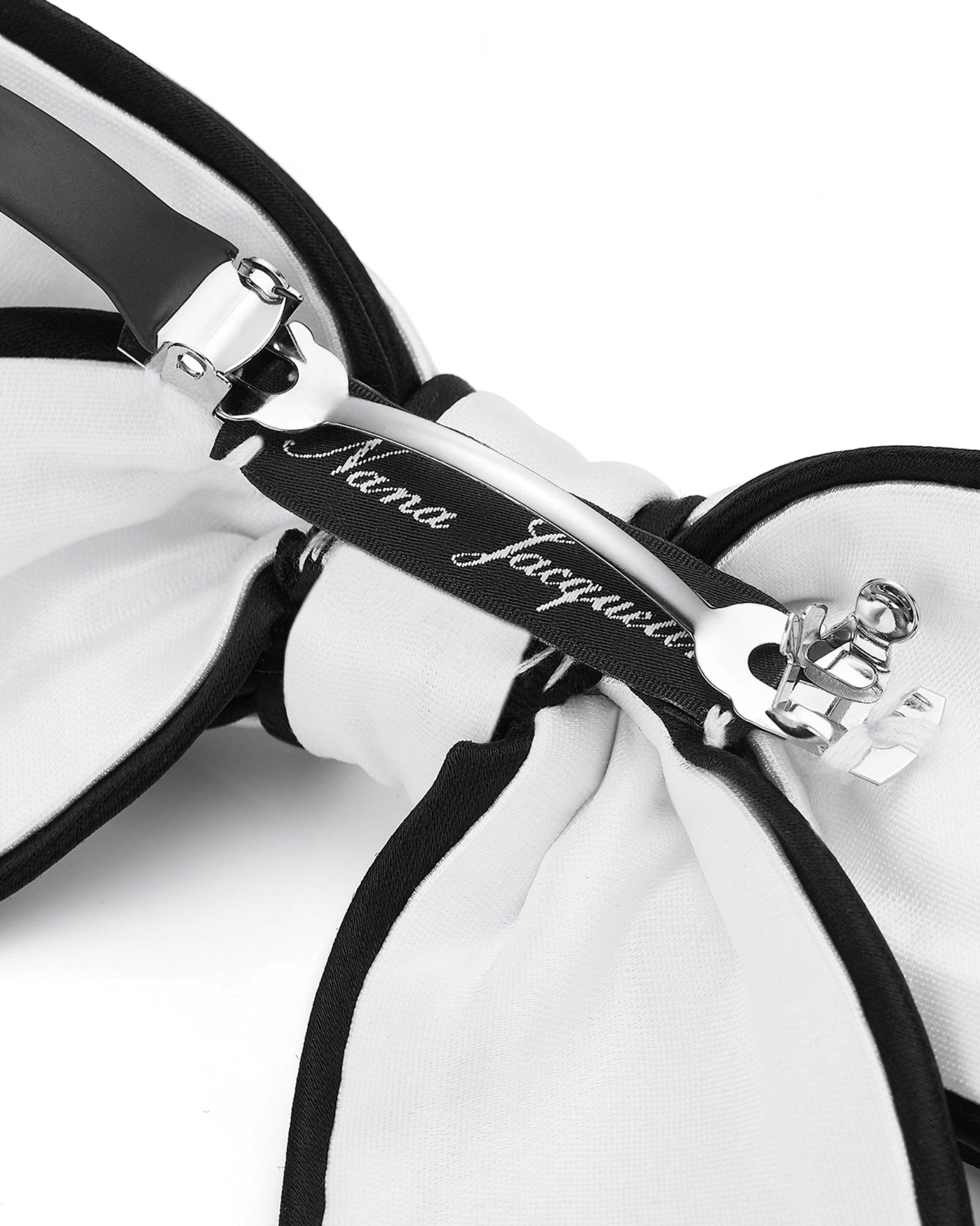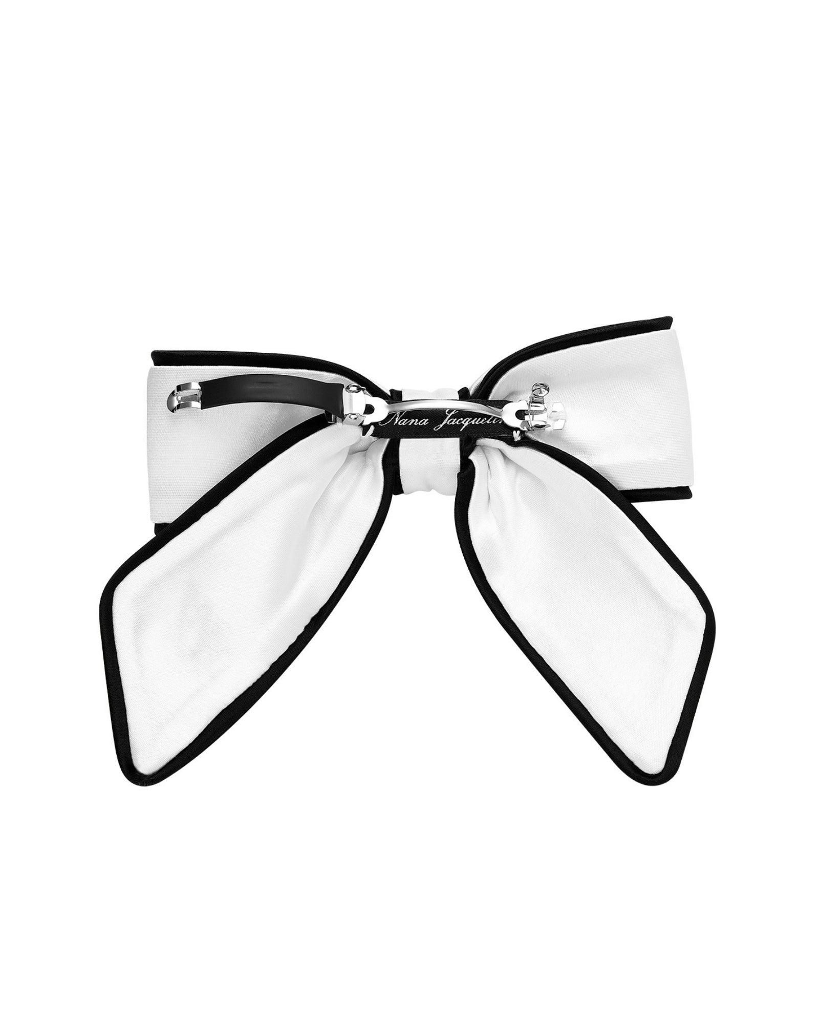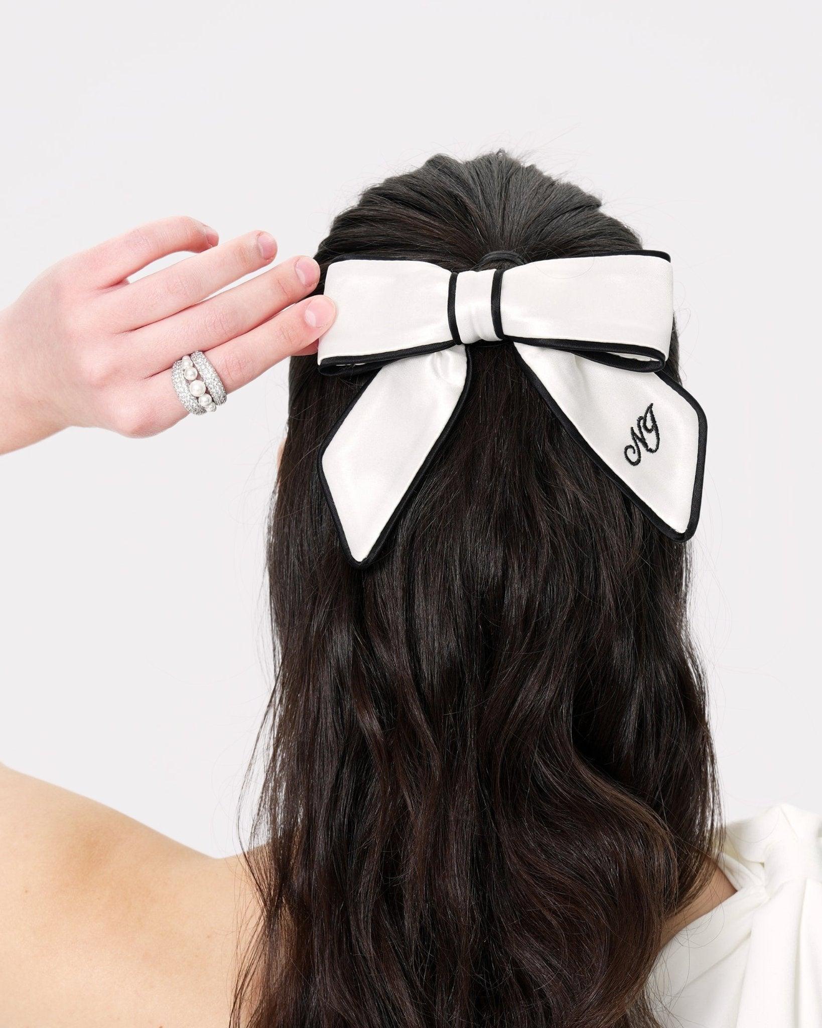 Make every hairstyle feel special with the Marlene Bow in white satin, finished with sleek black edges and elegant “NG” embroidery. Designed with a secure alligator clip, it’s perfect for everyday wear or dressing up for events. This timeless accessory adds a touch of charm and sophistication to your look.