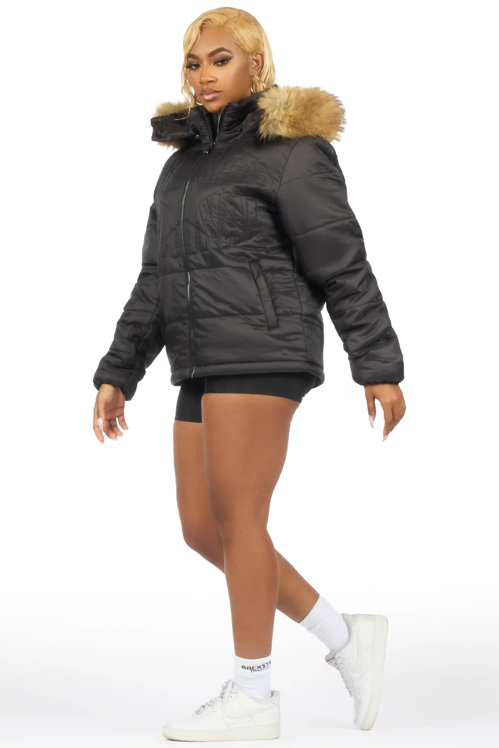A trendy oversized quilted puffer jacket for women in black. Designed with water-resistant fabric for optimal warmth. Full front dual zip closure Ribbed knit trims Removable button hood Slant zip pockets Water-resistant outer shell Custom RSO logos