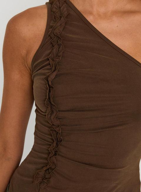 Top One-off the shoulder, ruched with frill detail, split hem Partially stretched, unlined 70% reclaimed fiber 30% polyester Cold hand wash
