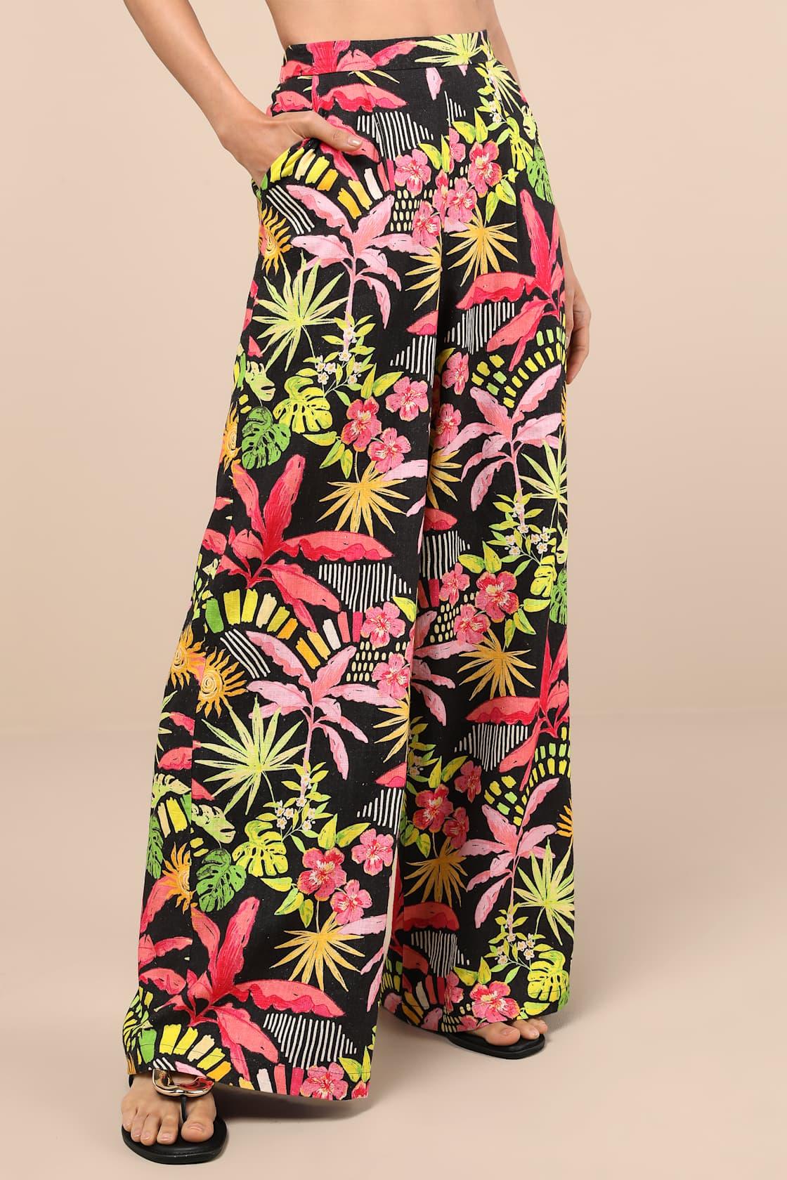 Easy to style and even easier to compliment, these vibrant tropical print pants are ready to jet set to paradise whenever you are. The chic high-rise silhouette features a banded waist and breezy wide legs with side seam pockets and full-length hems. Elastic at back for fit. Pair with the matching top for a complete look!
