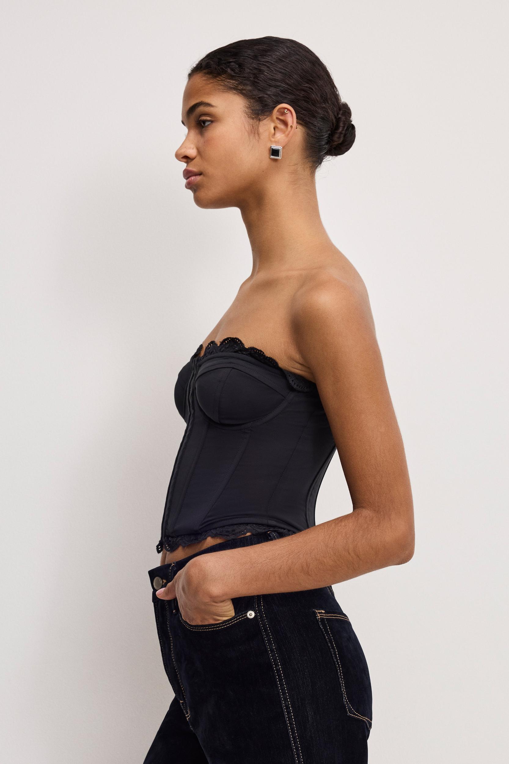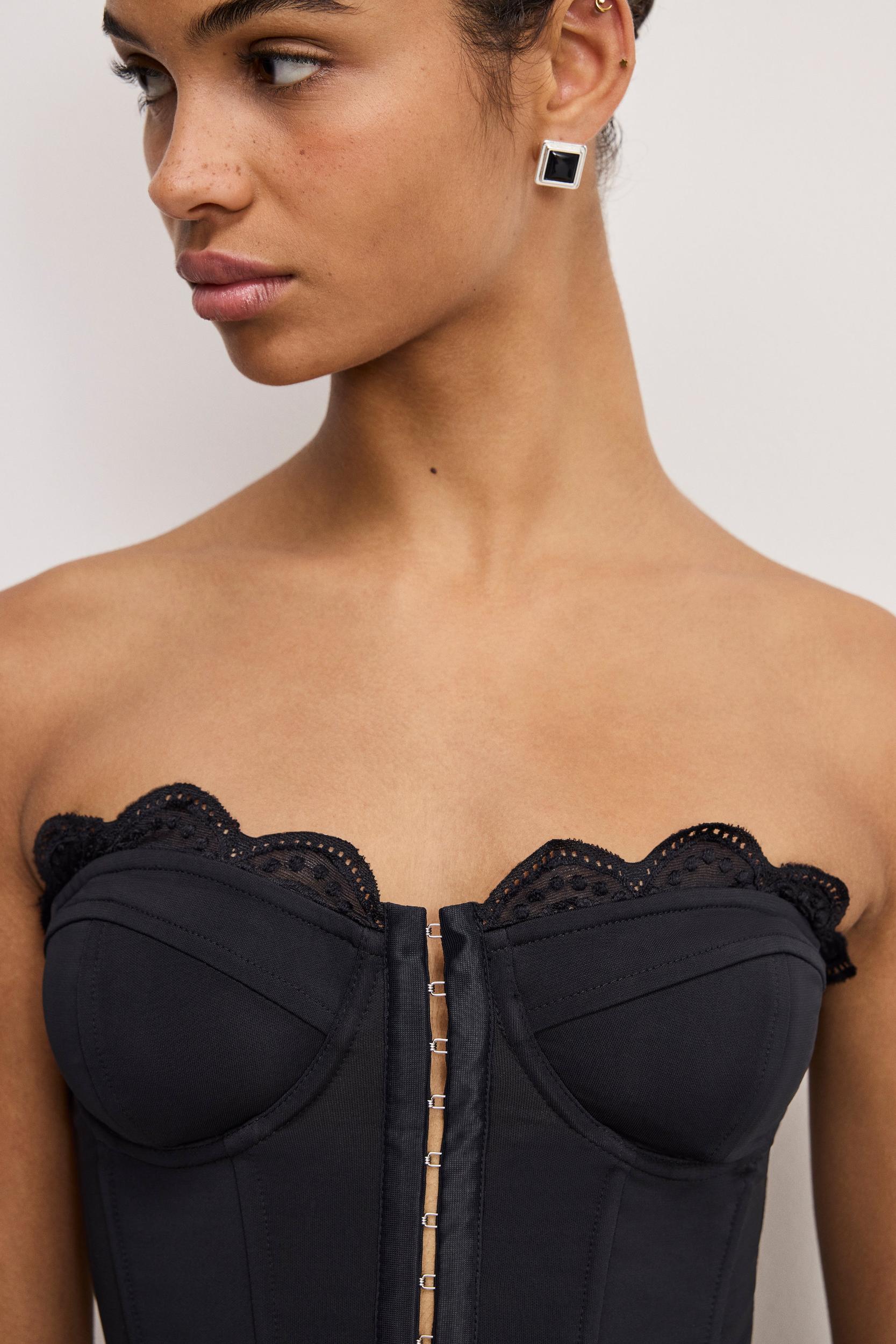Our Matte Jersey Lace Trim Bustier is made from smooth, matte jersey that molds to your shape, with delicate lace trimming that adds a touch of romance. The bustier-style bodice gives you a sculpted fit, while the stretchy fabric keeps things comfortable. Sleeveless Scalloped edging Flexible boning Underwire bust cups Model is size XS, 5’9” and wearing size XS. Fabric: 96% Viscose, 4% Elastane Care: Machine wash cold on gentle cycle. Non-chlorine bleach only when needed. Tumble dry low.