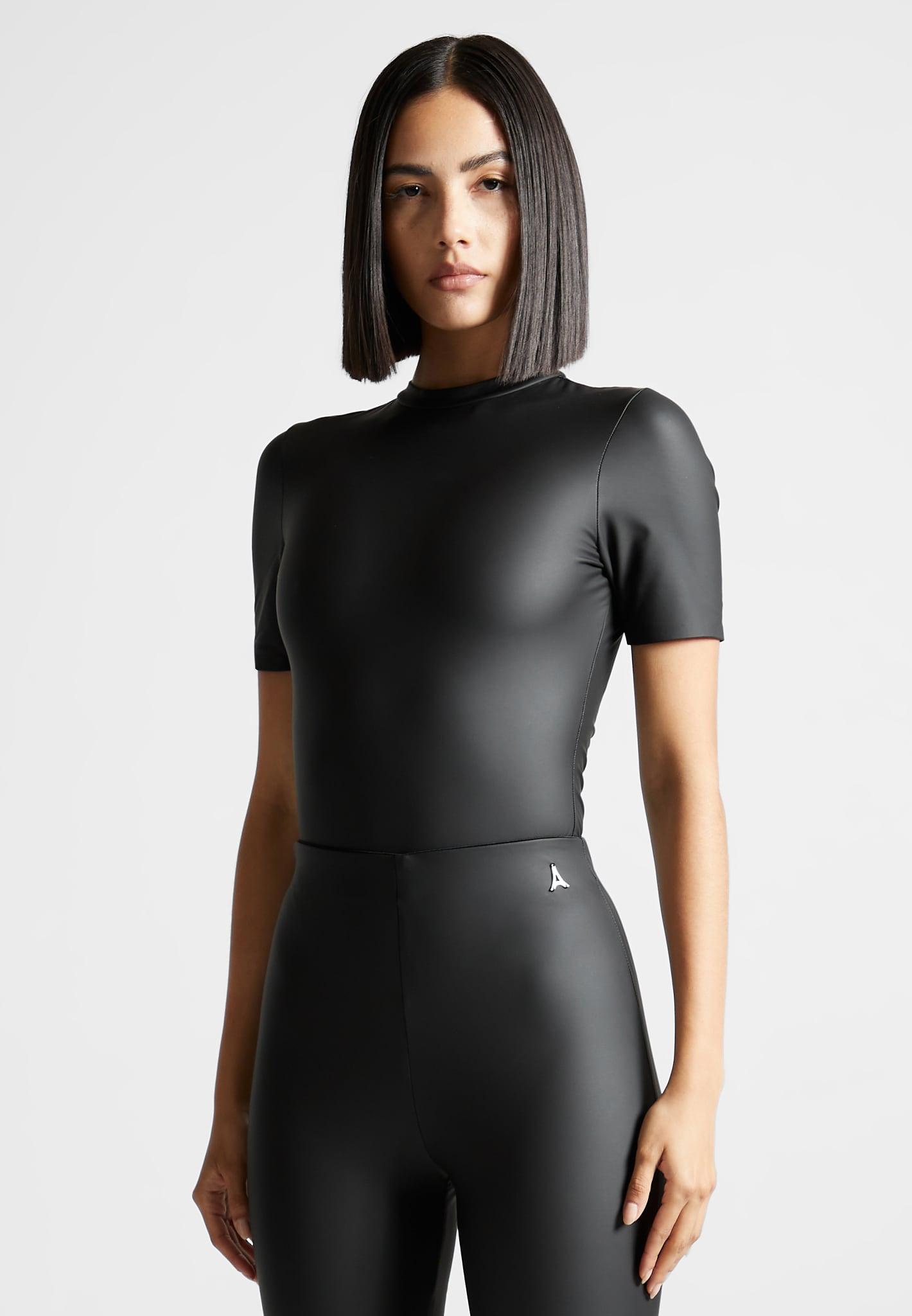 This classic Matte Vegan Leather Tee Bodysuit will effortlessly take you from day to night in style. Its sleek design is sure to make a statement without compromising on comfort. Create your perfect look with this must-have piece. Fabric: Always check the care label for wash instructions. Model is 5'8", 32.5" Bust, 24" Waist, 32" High Hip, 37.5" Low Hip and Wears UK Size 6 Based on UK Size 6 - Front Length cm/in, Chest cm/in, Sleeve Length cm/in Stretch Factor - /3