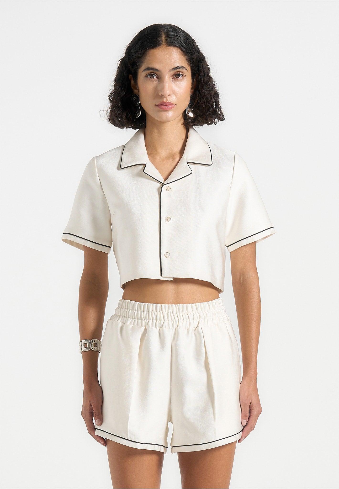 This cropped short-sleeve shirt offers a refined take on casual tailoring. Crafted from a crisp, structured fabric, it features a boxy silhouette with a notched collar and clean button front. Contrast piping along the collar and sleeves adds a subtle graphic edge, while the cropped length lends a modern, youthful feel. Perfect for pairing with high-waisted trousers, skirts, or coordinated sets. Boxy cropped silhouette for a clean, contemporary shape Notched collar with contrast piping for tailored detailing Short sleeves with piped cuff accents Button-down front with tonal buttons Mid-weight woven fabric with structure and ease Leather Manière De Voir Patch on reverse for a high-end finish 100% PolyesterAlways check the care label for wash instructions.
