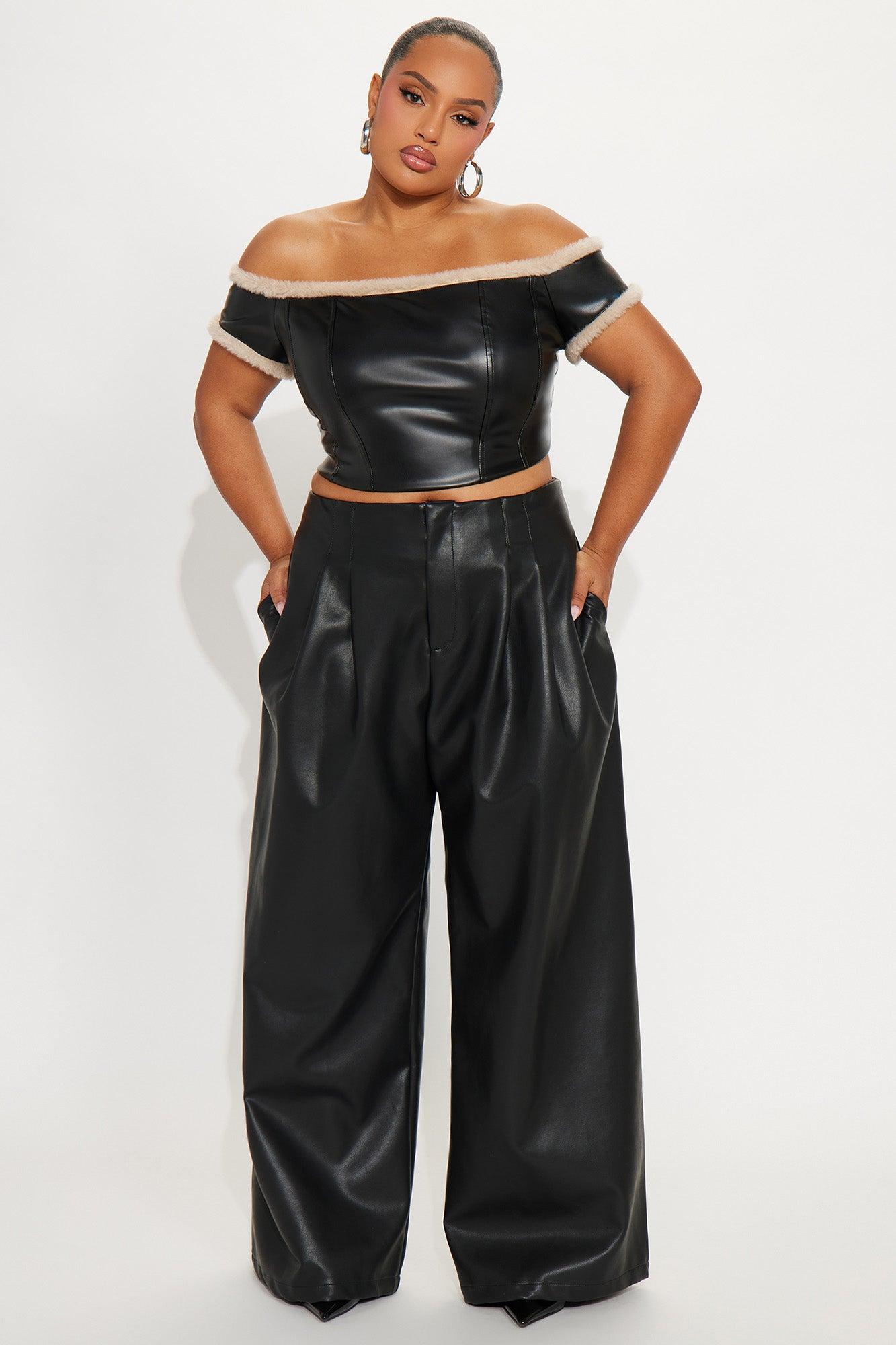 Available In Black. Wide Leg Pant High Rise Hook And Eye Zip Closure Faux Leather 32" Inseam Non Stretch Shell: 55% Polyester 45% Polyurethane Contrast: 100% Polyester Imported