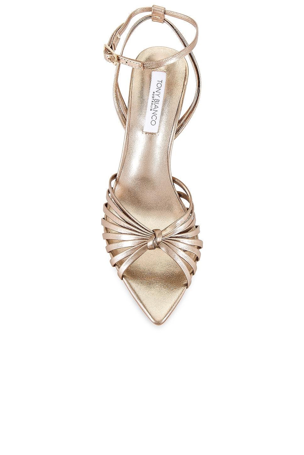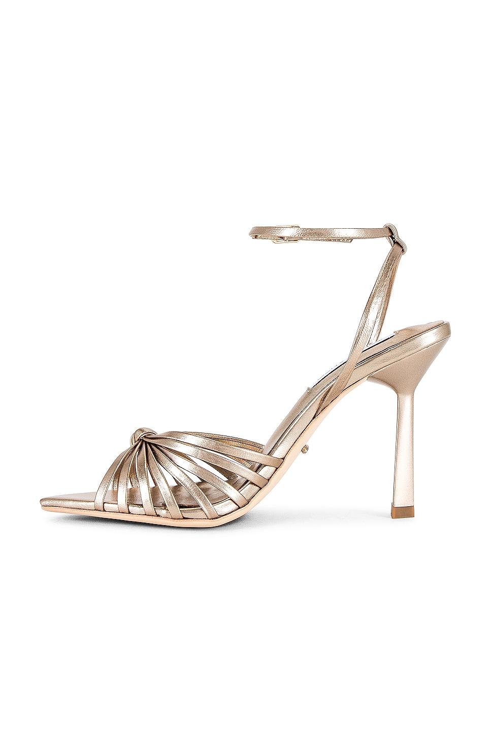 Metallic leather upper with manmade sole. Made in China. Ankle buckle closure. Leather footbed and lining. Strappy and knotted vamp. Pointed toe with stiletto heel. Approx 95mm/ 3.75 inch heel. Revolve Style No. TONR-WZ712. Manufacturer Style No. MAXOS.