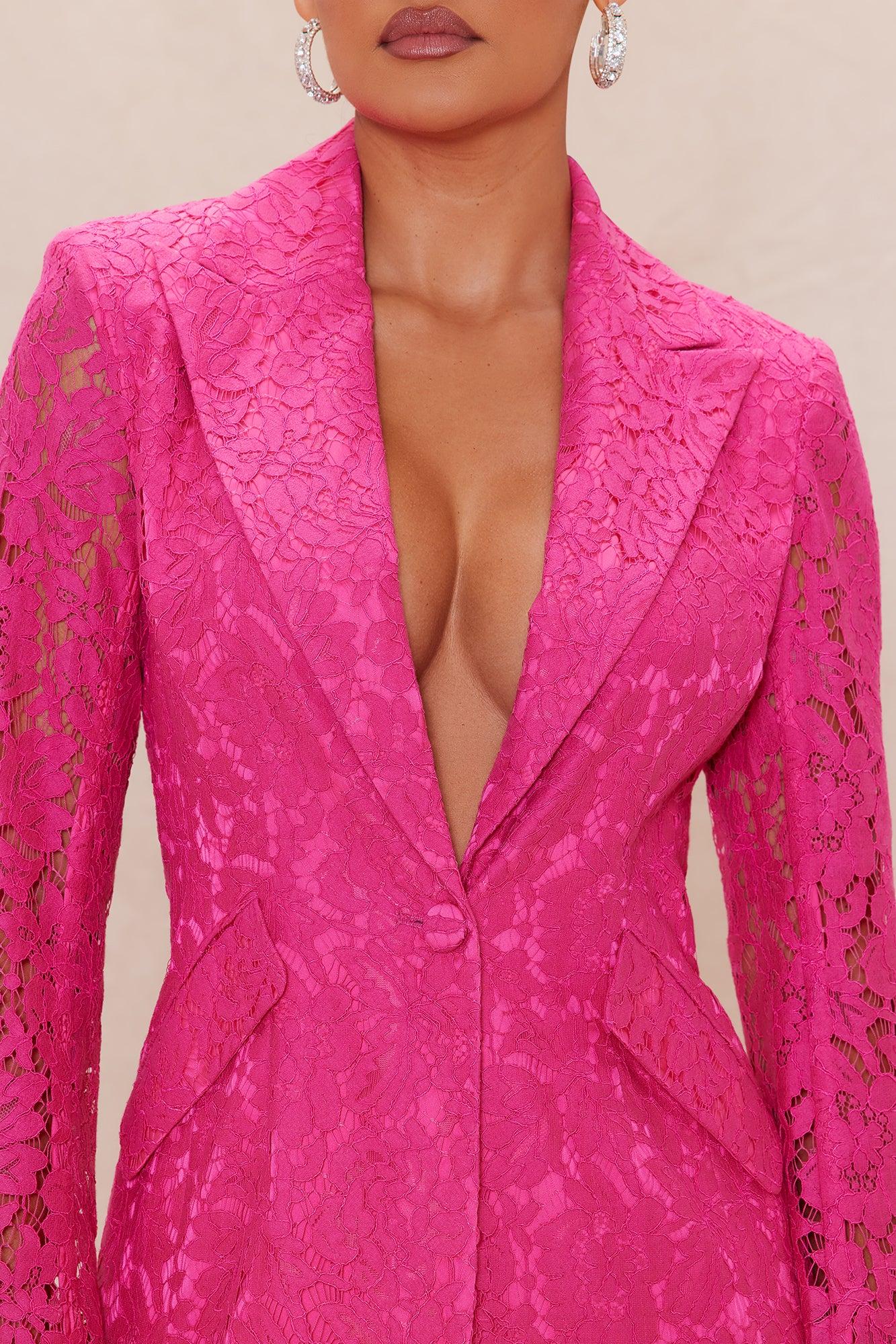 Available In Pink. Lace Blazer Collar Long Sleeve Shoulder Pads Pockets Button Closure Lined No Stretch Shell: 35% Nylon 35% Cotton 30% Rayon Lining: 97% Polyester 3% Spandex Imported California Proposition 65WARNING: Cancer and Reproductive Harm - www.P65Warnings.ca.gov.