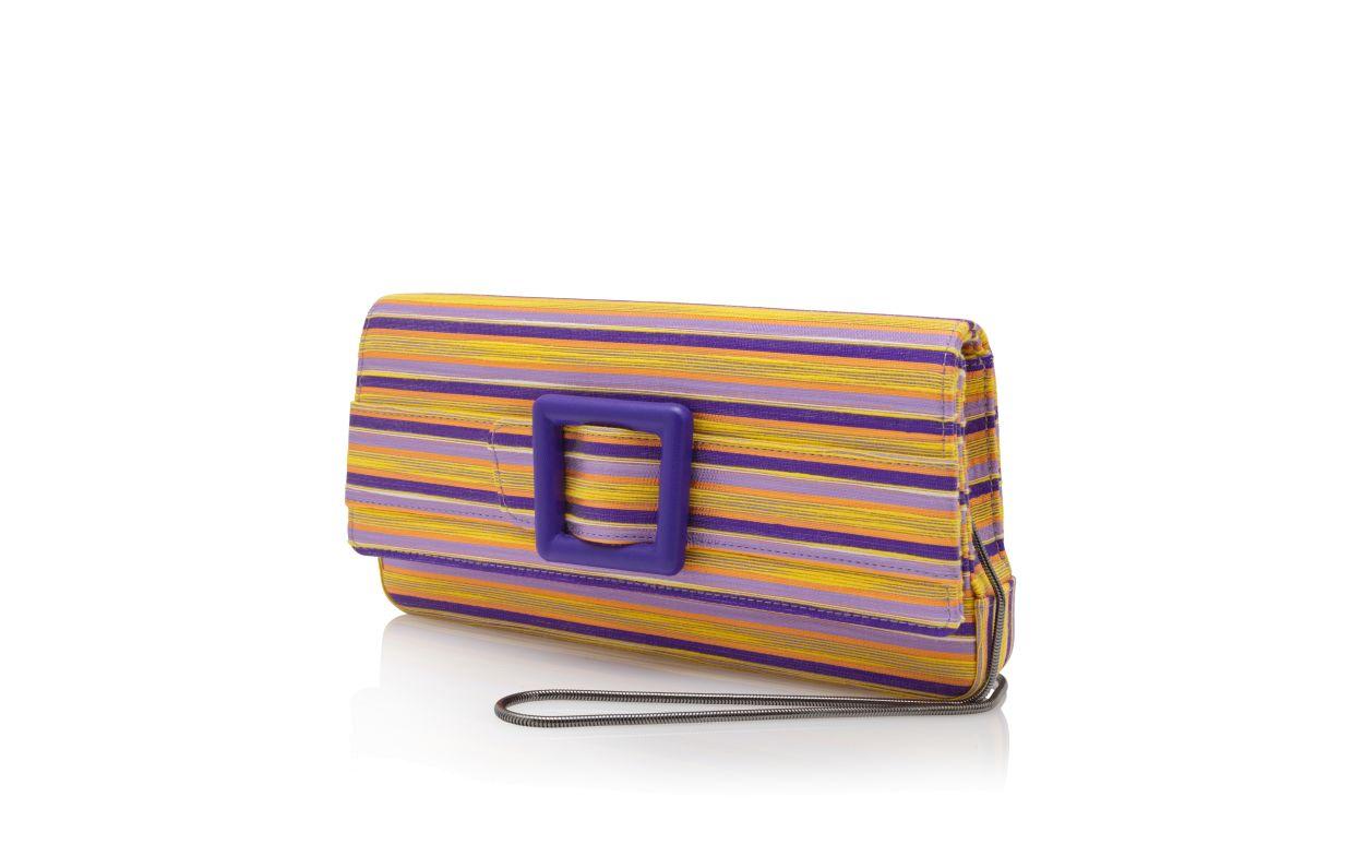 Purple and orange cotton clutch bag featuring woven striped motif, flap-over design with magnetic closure and nappa leather decorative buckle. Contains internal compartment, mirror and removable chains with two length options.