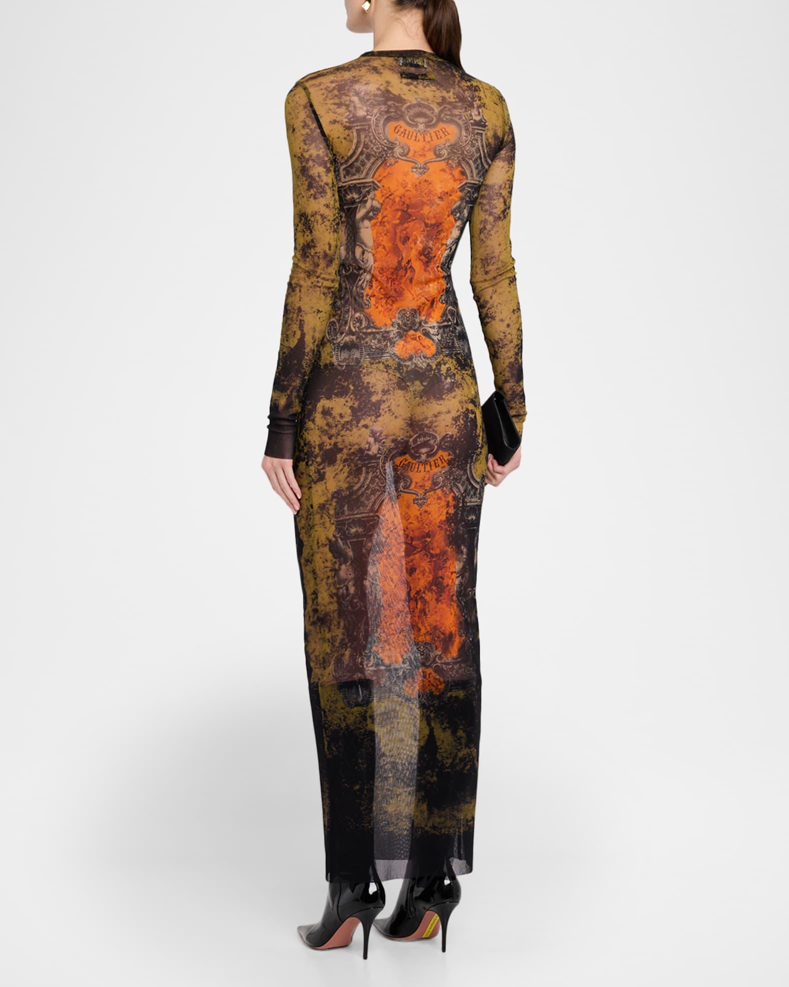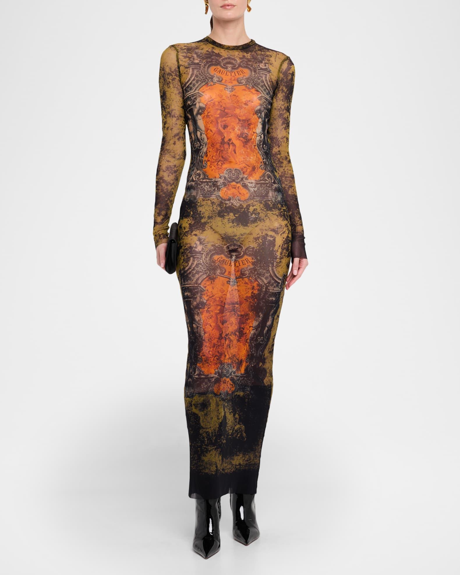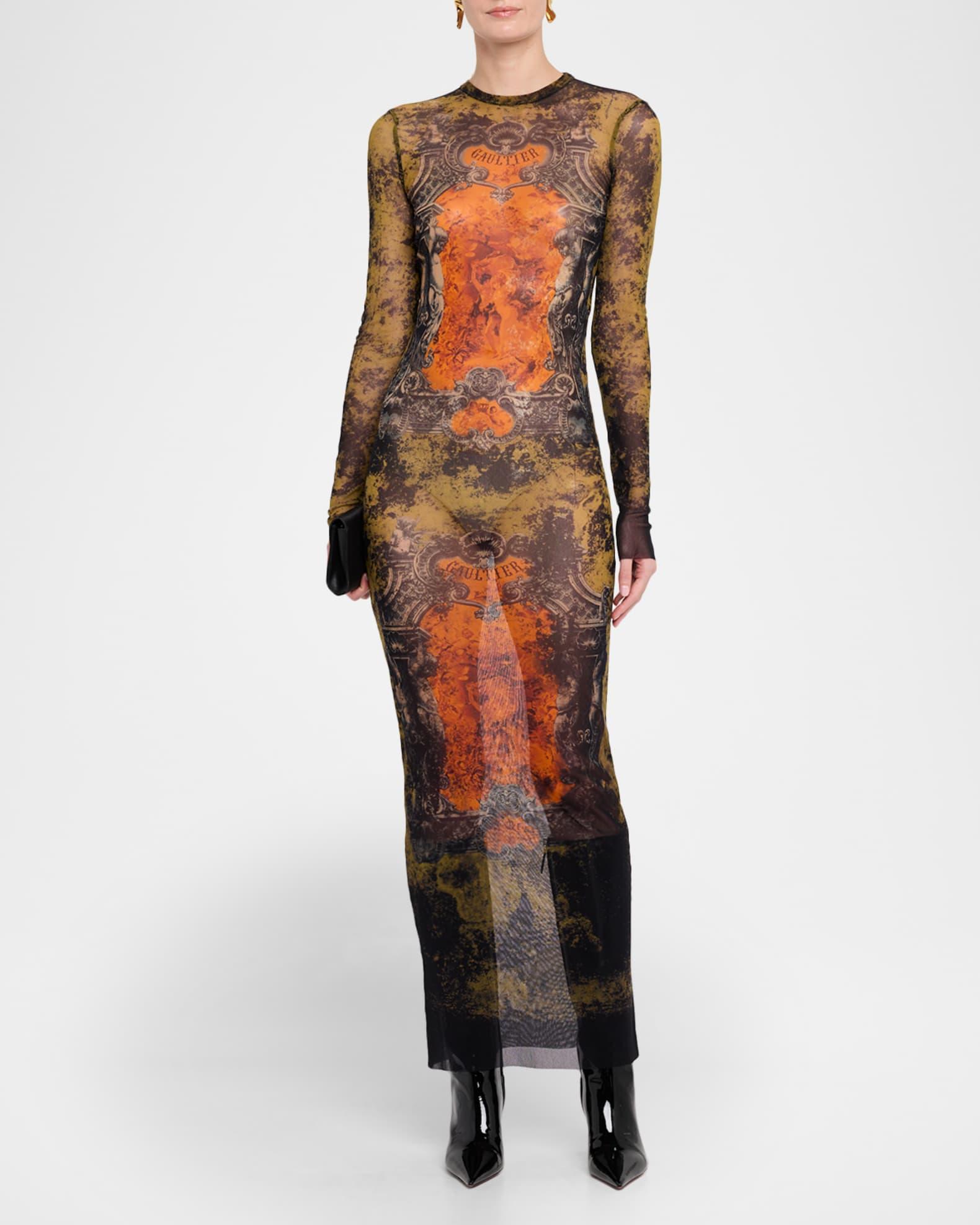 Medallion-Print Mesh Long-Sleeve Maxi Dress