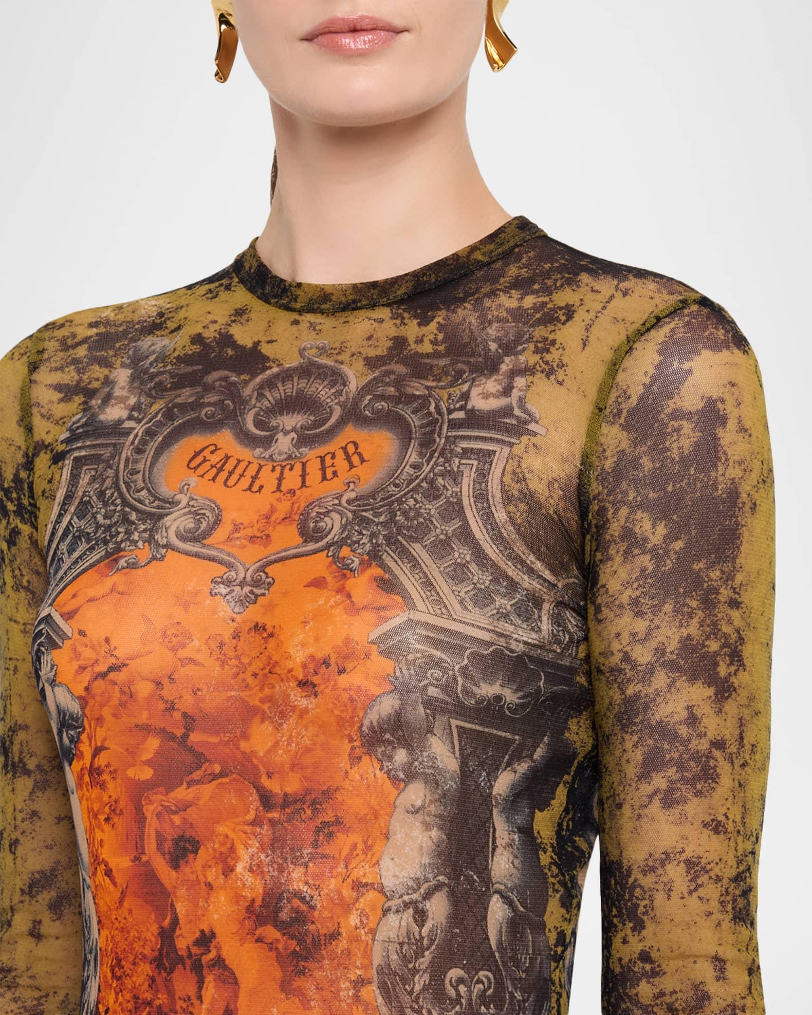 Jean Paul Gaultier mesh dress featuring a medallion print Round neckline Long sleeves Body-conscious silhouette Full length Slipover style Nylon/polyamide Made in Italy