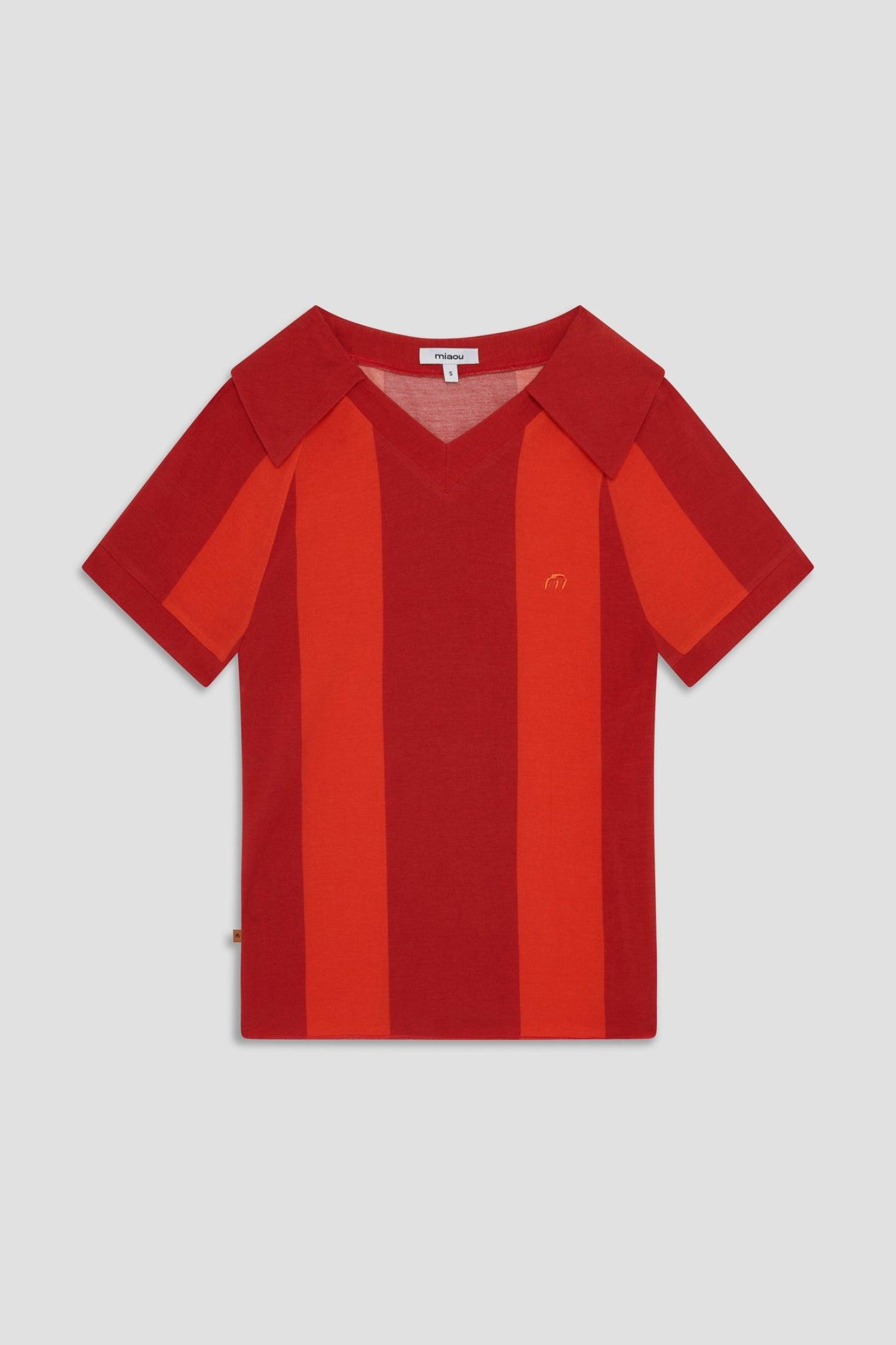 The Mel Tee gets an update with a collar and stripes. This short sleeve polo-tee hybrid with a v-neck is perfect for everyday wear.