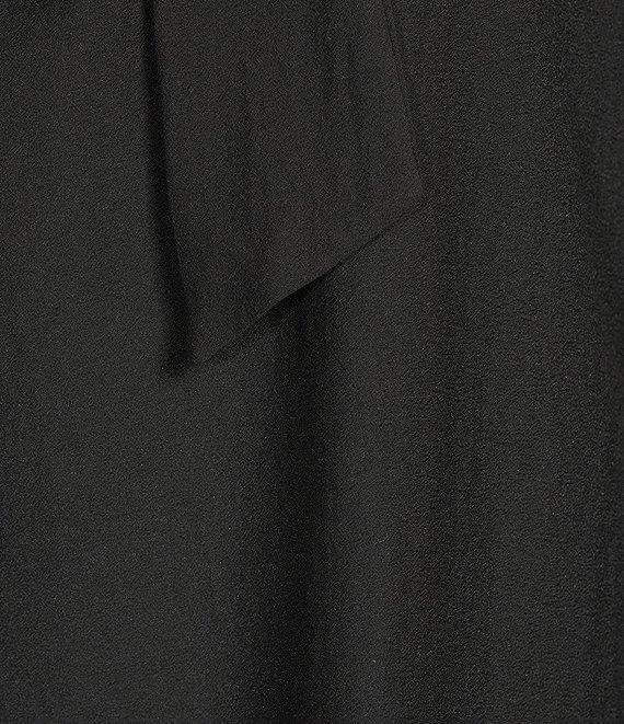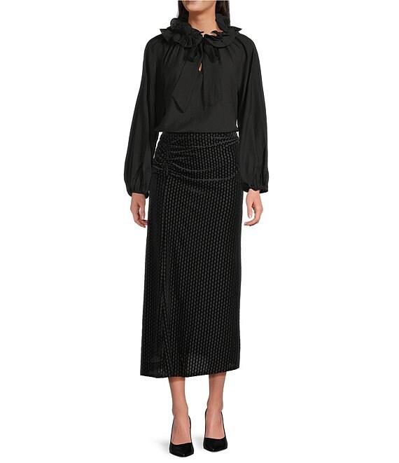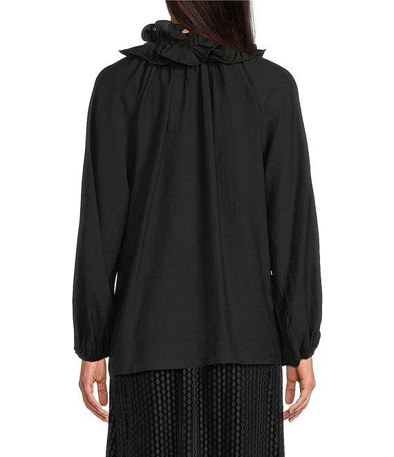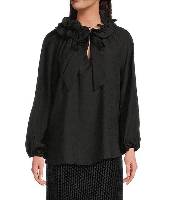 From MELLODAY, this blouse features: Crepe fabrication Tie front round keyhole neck Ruffle collar Long sleeves Straight hemline Pullover construction Approx. 28.75" length Polyester/acetate Hand wash/hang to dry Imported.