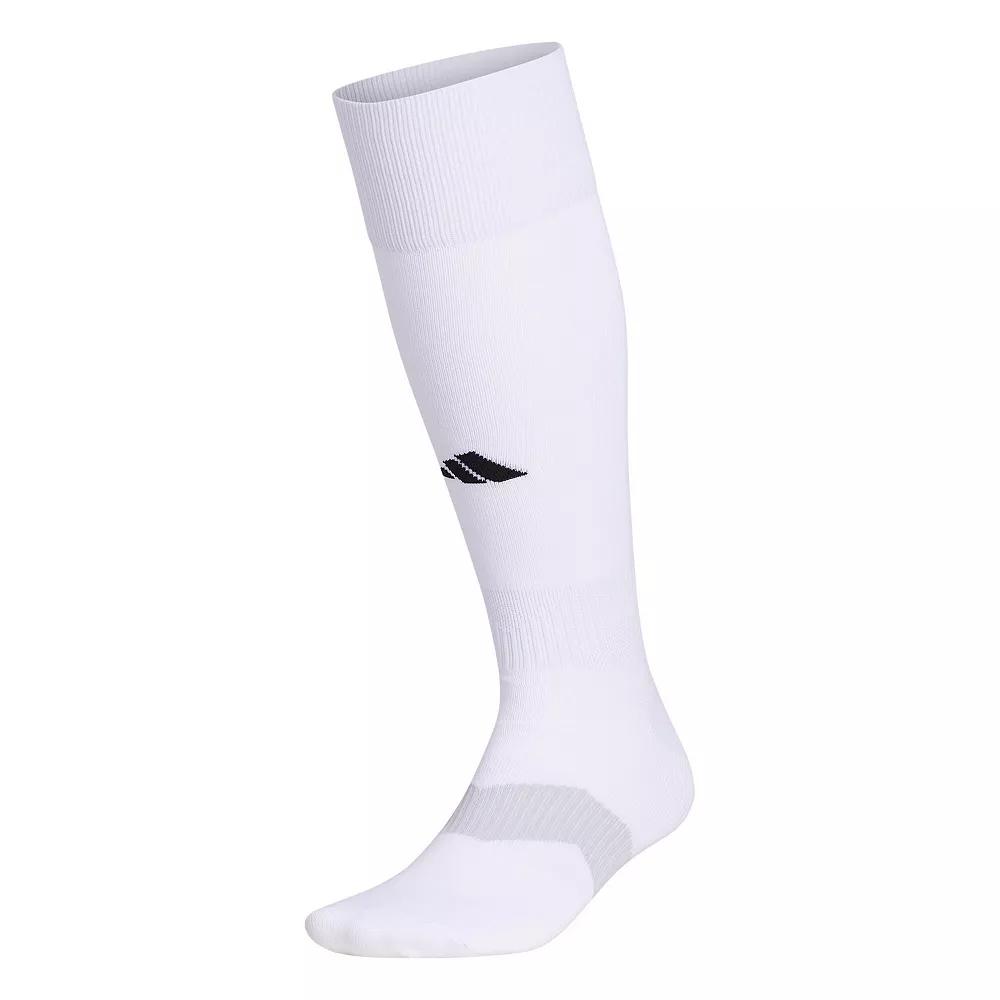 Show your skills in these adidas soccer socks. The soft yarns are made with a bit of stretch so they keep your shin guards in place. Compression in the arch and ankle ensures you stay comfortable and supported through every sprint..... Over-the-calf length. 89% nylon, 8% polyester, 2% natural latex rubber, 1% elastane. Lightweight and durable. Double-welt construction. Arch and ankle compression. NCAA compliant. Imported. Adidas Mens Metro Over-The-Calf Soccer Socks