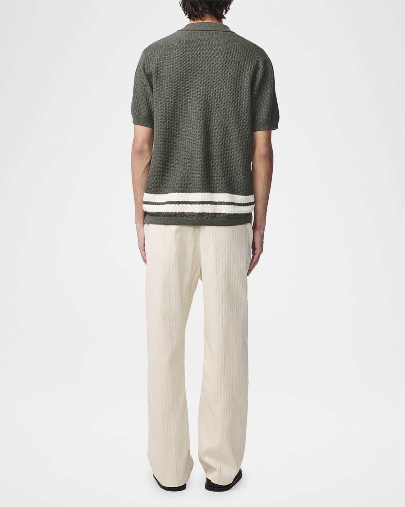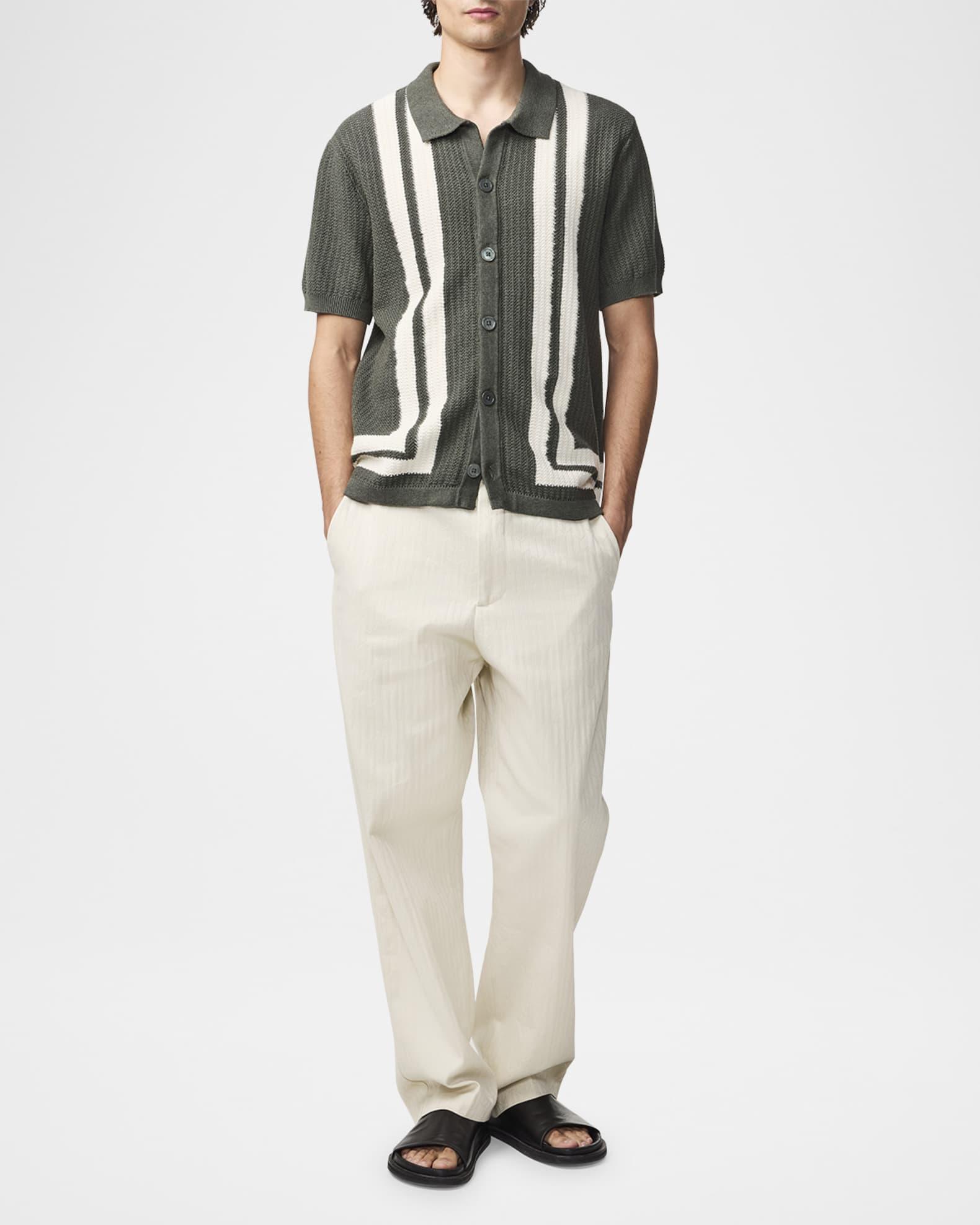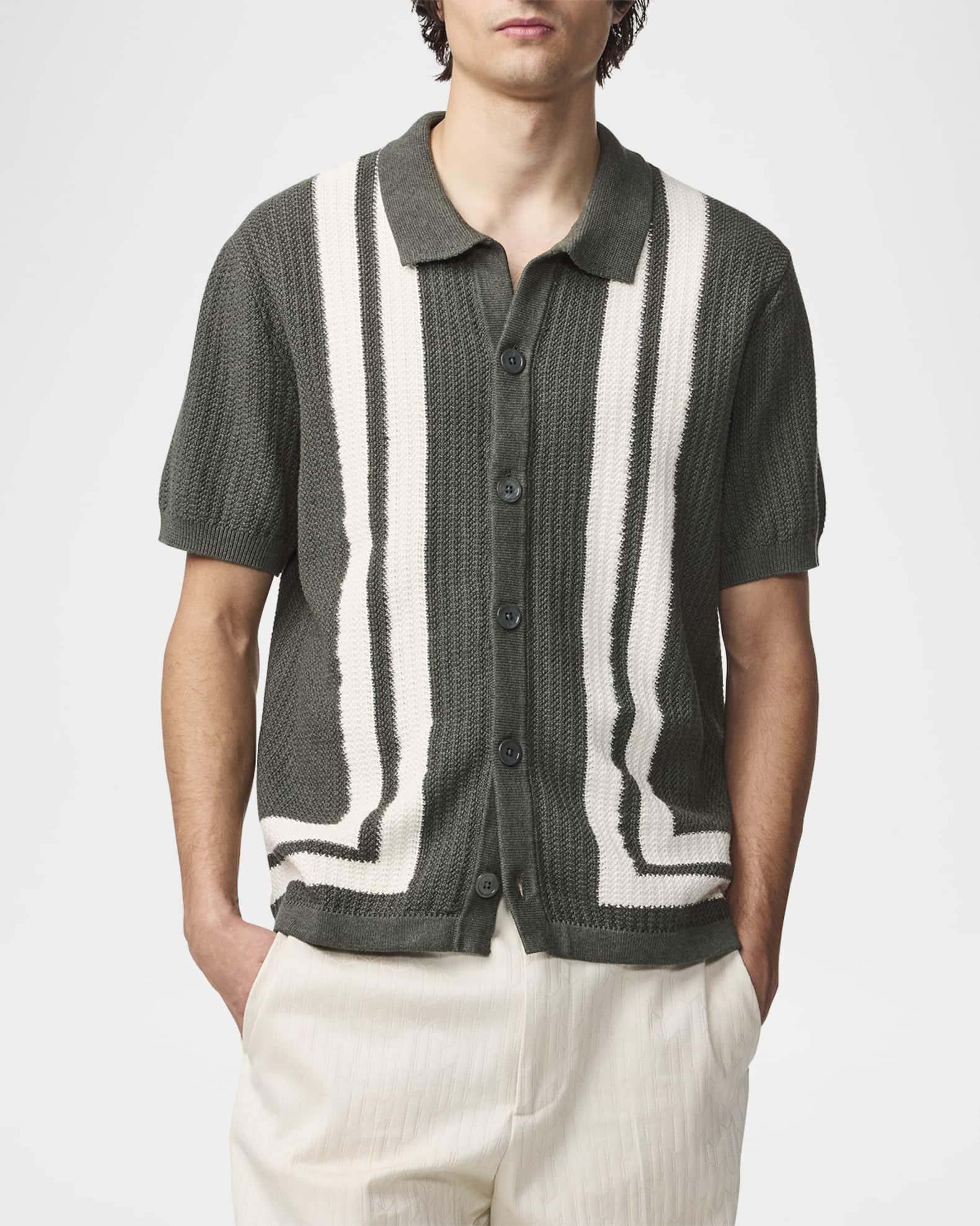 NN.07 "Ares" rib-knit shirt crafted from ultra-soft organic cotton, in a textured stitch with stripe detailing Mother-of-pearl buttons Spread collar Button placket Short sleeves; approx. 9.8"L Ribbed cuffs and hem Organic cotton Machine wash cold, line dry Imported