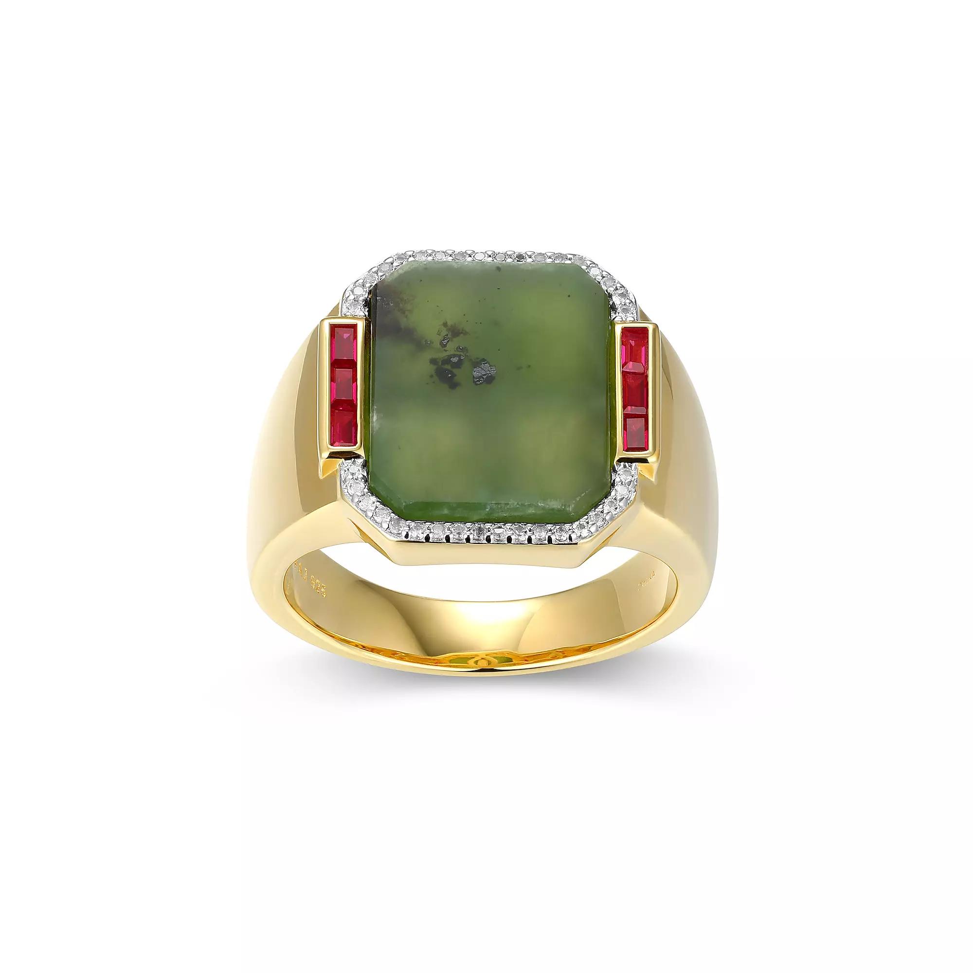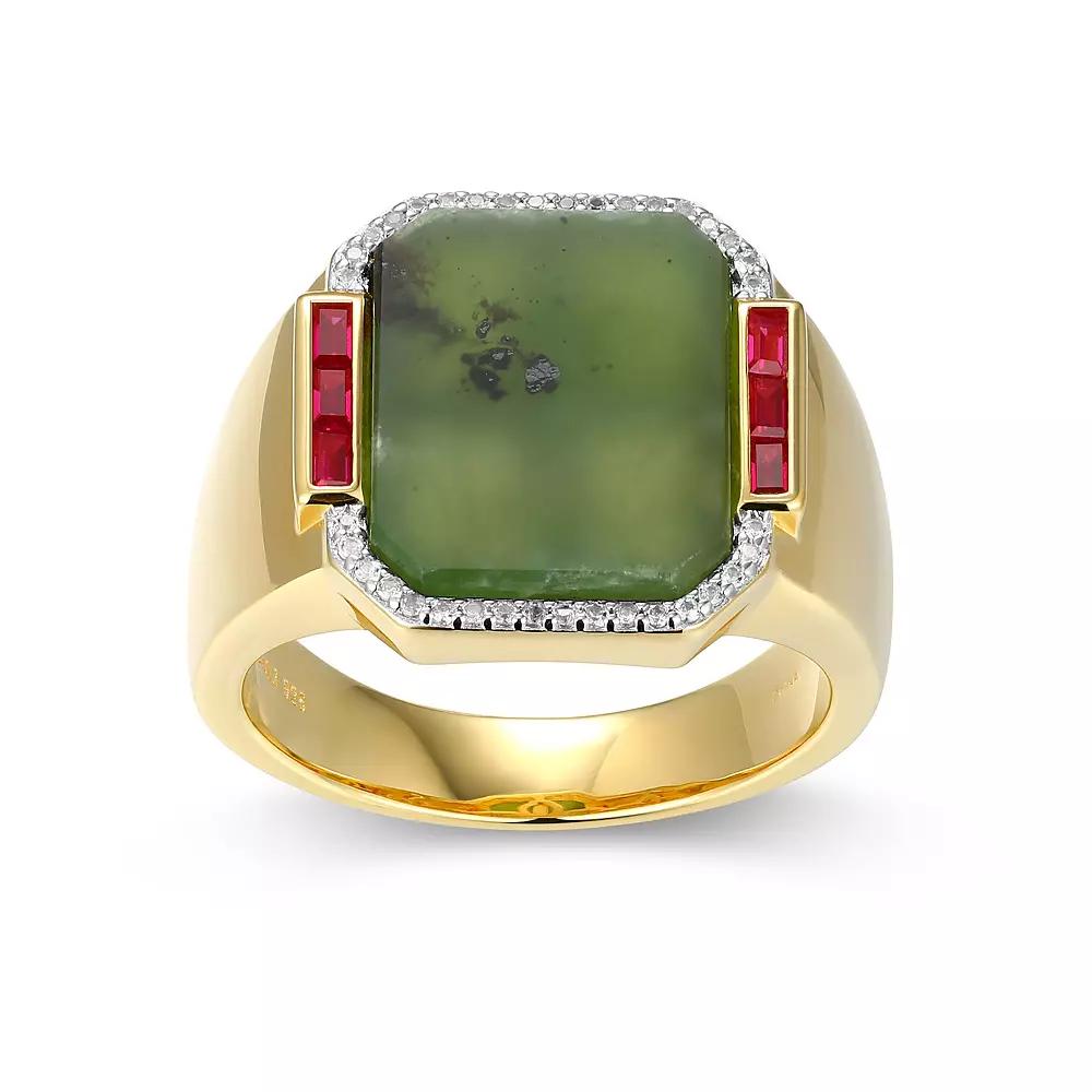 Hell show off his style with this mens Dynasty Jade 18k gold over sterling silver jade, lab-created ruby & lab-created white sapphire ring. Click on this JEWELRY & WATCHES GUIDE to learn about fit, styles, materials and more! Hell show off his style with this mens Dynasty Jade 18k gold over sterling silver jade, lab-created ruby & lab-created white sapphire ring. Click on this JEWELRY & WATCHES GUIDE to learn about fit, styles, materials and more! FEATURES Width: 17 mm Shank style: tapered Band fit: comfort fit Nickel safe Metal: sterling silver Plating: 18k gold, rhodium Finish: polished Packaging: boxedSTONE DETAILS Stone type: nephrite jade, lab-created ruby, lab-created white sapphire Shape: emerald cut, rectangle, round Setting: channel, glue/epoxy, pave Gemstones may have been treated to enhance their appearance. Special care may be required. Please visit our Gemstone Treatment & Special Care Guide for more information. Size: 11. Color: Gold Tone. Gender: male. Age Group: adult.
